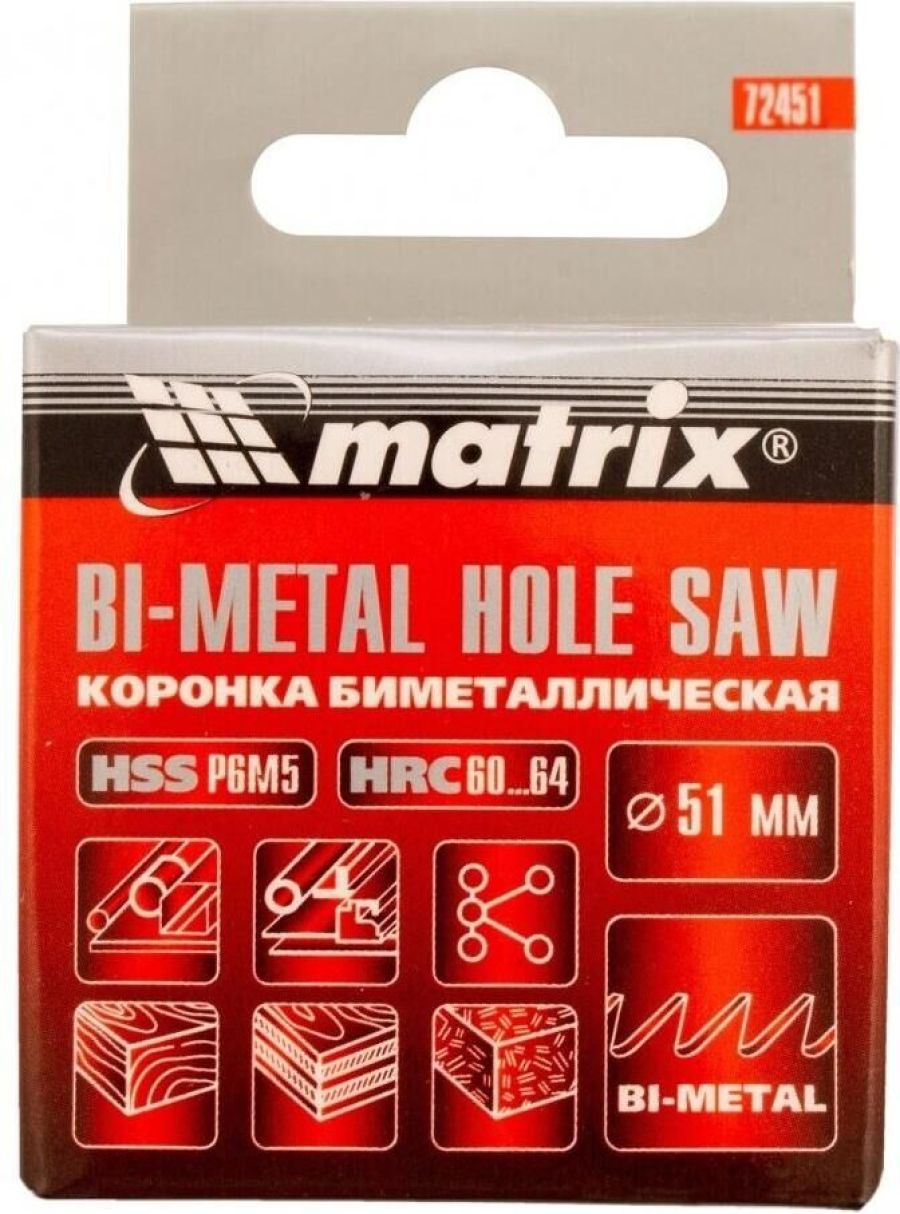 Коронка Matrix BIMETAL 72451 диаметром 51 мм — режущий инструмент, который устанавливается на дрель, перфоратор или стационарный станок. Используется для быстрого сверления черных и цветных металлов, пластика и других материалов. Позволяет получить отверстия большого диаметра при проведении электромонтажных работ и прокладке коммуникаций.ПреимуществаНадежная конструкция — корпус выполнен из углеродистой стали, зубья приварены методом электросварки.Эффективность — рабочая часть из быстрорежущей стали обеспечивает высокую скорость сверления.Совместимость с разными типами патронов — на коронку можно установить хвостовик с шестигранным или SDS PLUS профилем Matrix 72490, 72492, 72494, 72496 (приобретается отдельно).