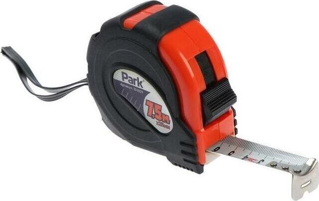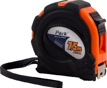 TM29-7525 7,5x25мм Рулетка Park с одним фиксатором, двухкомпонентный прорезиненный корпус (АБС-пластик (ударопрочный пластик) и термопластичная резина) Материал изготовления: металл, пластик, термопластичная резина. - Крючок TRUE ZERO с прорезью для проведения радиусов. - Пружина с постоянной жесткостью. - Ударопрочный пластик