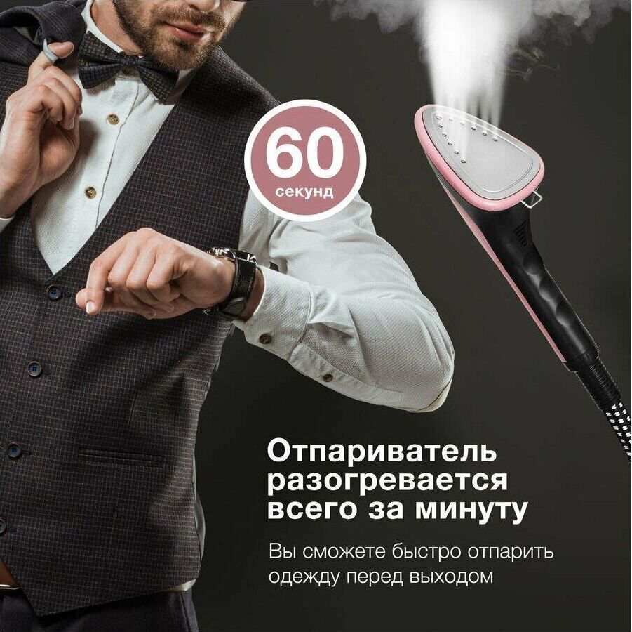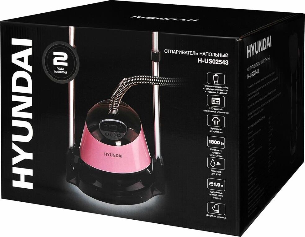 Мощность 1800 Вт Подача пара 40 г/мин Регулировка подачи пара Количество режимов подачи пара 9 шт Время нагрева 60 с Время непрерывной работы, до 40 мин Горизонтальное отпаривание Вертикальное отпаривание Долив воды во время работы Модификация напольный Постоянная подача пара Емкость резервуара для воды 1.5 л Съемный резервуар для воды Длина шнура питания 1.9 м Длина шланга для подачи пара 1.35 м Регулируемая стойка Высота стойки 125 см Вес 5.8 кг Цвет розовый Дополнительный цвет черный Насадка-щетка,варежка, встроенная вешалка Защита от перегрева Подходит для любых типов тканей Срок гарантии 24 мес.