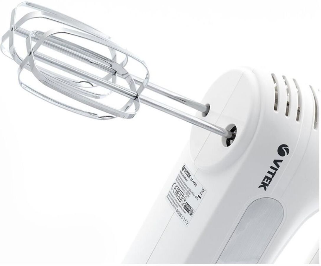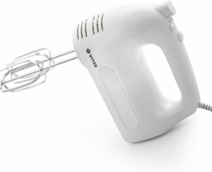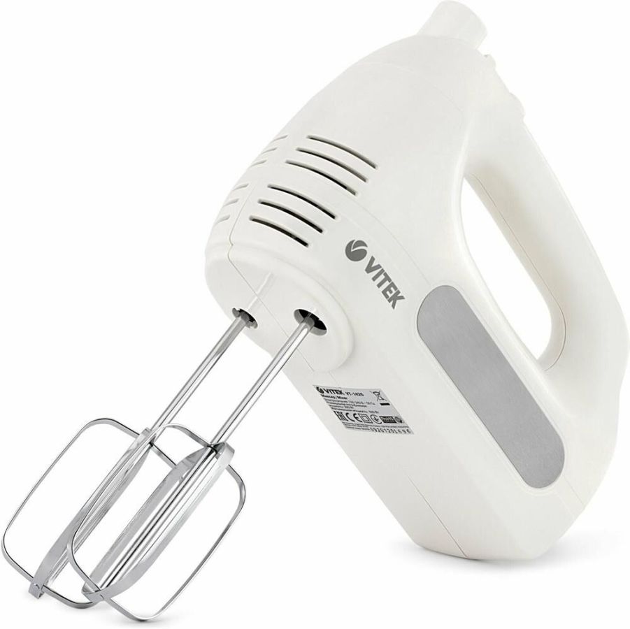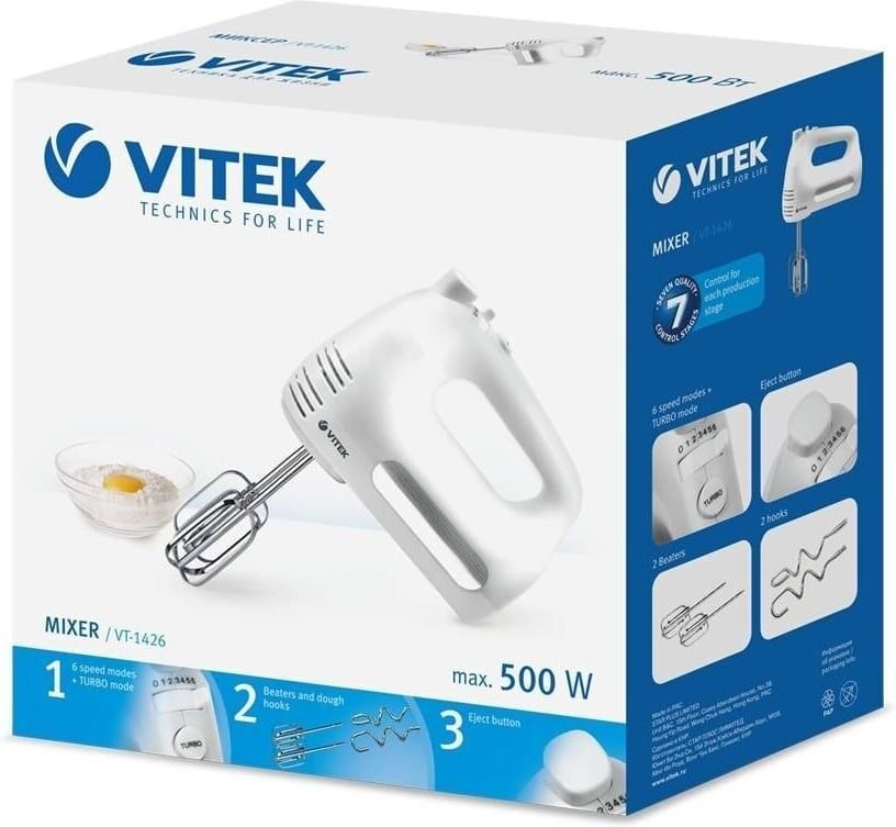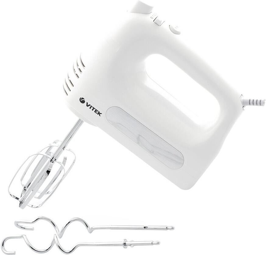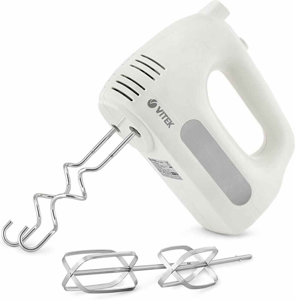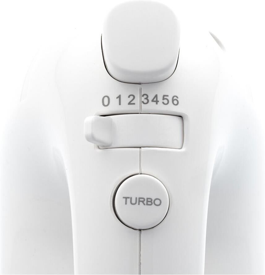 Мощность 500 вт, Число скоростей: 6, Турборежим, Венчик для взбивания: 2, Крюки для замешивания теста, Количество насадок: 4, Кнопка отсоединения насадок, Материал корпуса: пластик, Длина сетевого шнура: 120 см, Цвет: Белый