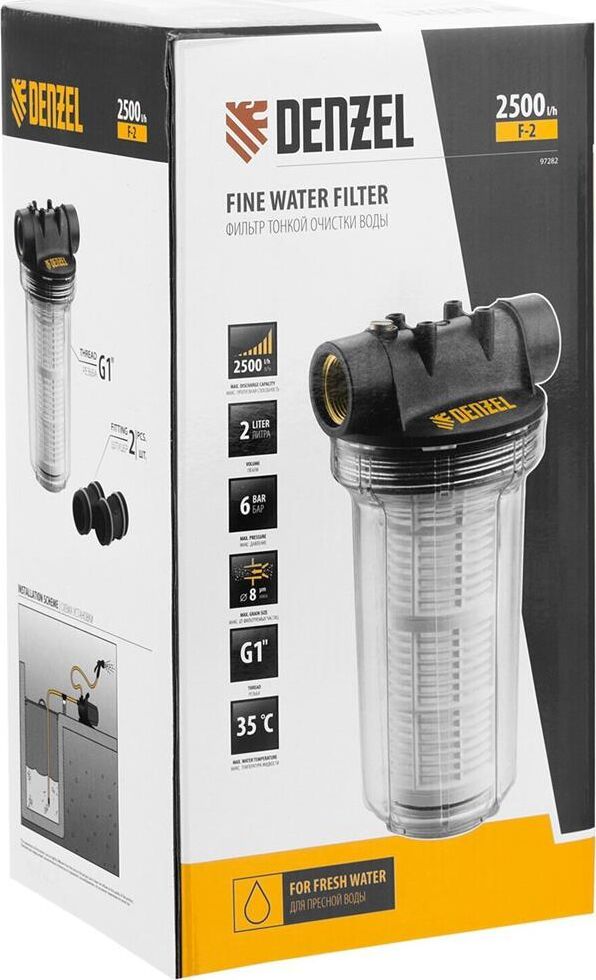 Фильтр тонкой очистки торговой марки DENZEL предназначен для очистки воды от инородных частиц, проходящих через насосные станции, поверхностные и дренажные насосы.