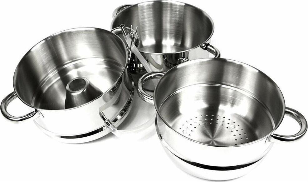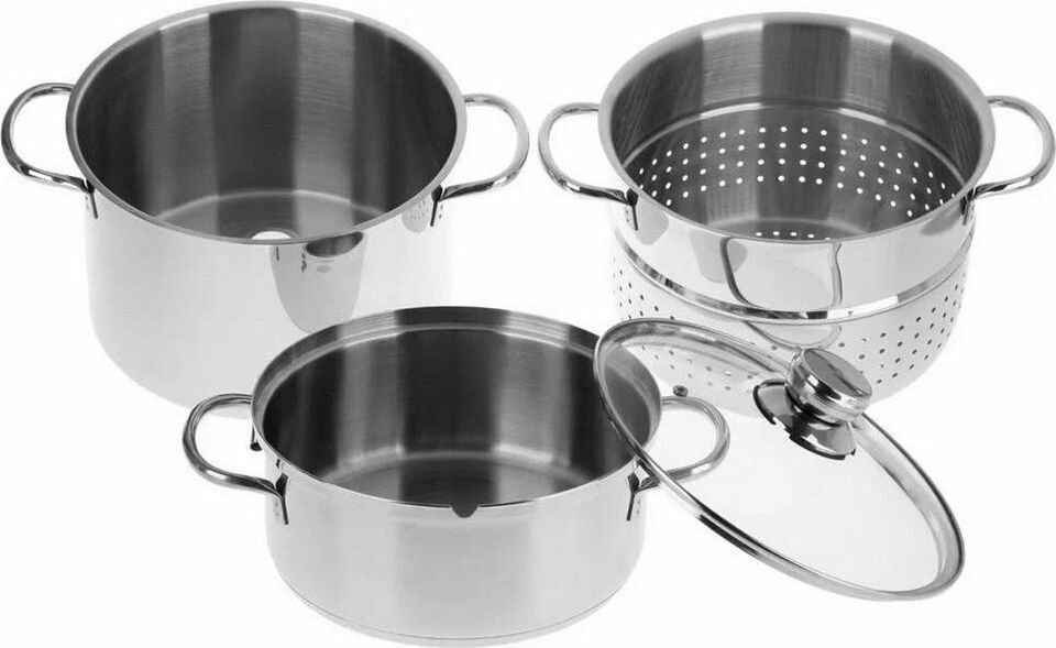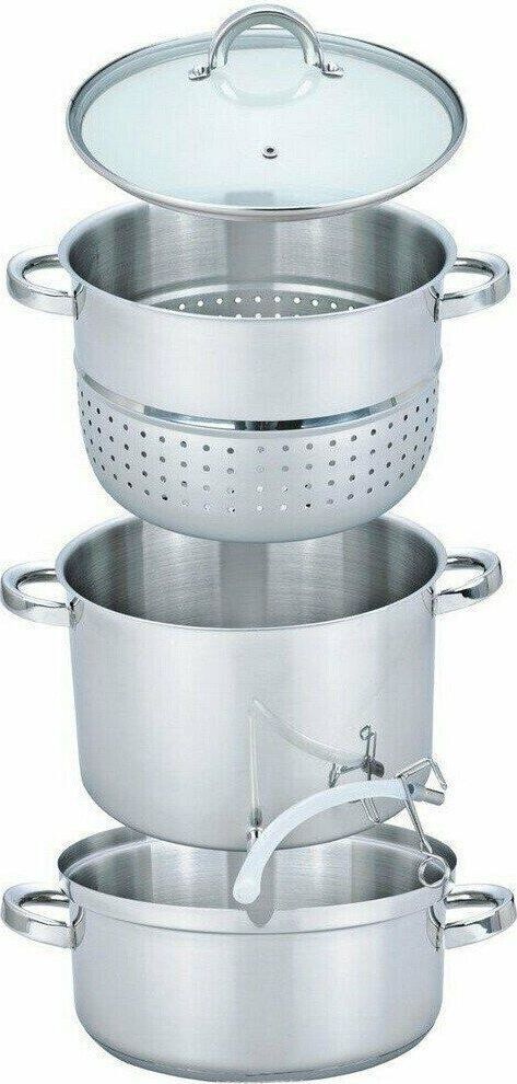 Объем 8 л. 3х-слойное капсульное дно. Дуршлаг для фруктов, овощей, ягод. Прозрачная стеклянная крышка с паровыпуском. Удобные ручки не нагреваются. Высококачественная нерж. сталь 18/10. Зеркальная полировка. Подходит к индукционным плитам.