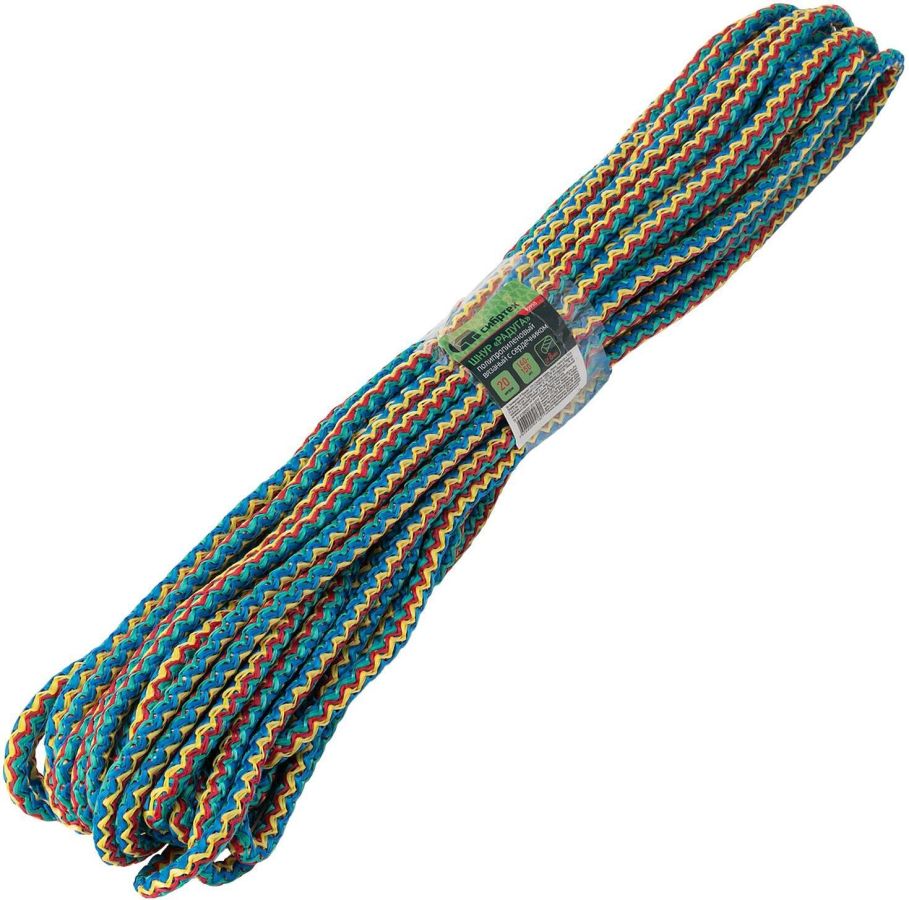 Вязаный полипропиленовый шнур с сердечником Сибртех «Радуга» 93955, диаметром 8 мм, длиной 20 м, будет полезен для хозяйственных нужд — сушки белья, связывания предметов. Пригодится также в походе, на охоте или рыбалке. Благодаря сердечнику и высокопрочной оплетке вязаный шнур обладает повышенной устойчивостью к истиранию и разрыву — максимальная разрывная нагрузка составляет 140 кгс. Изделие не растягивается и не провисает под значительным весом.ПреимуществаПолипропиленовый шнур мягкий и эластичный, поэтому образует надежные узлы.Полипропилен практически не впитывает влагу, за счет чего шнур защищен от гниения.За счет наличия сердечника изделие устойчиво к многократному изгибанию, а значит, прослужит долго.Хозяйственный шнур устойчив к воздействию химических веществ, а также температурным перепадам, и может использоваться вне помещения.Длина 20 м позволяет протянуть шнур на большое расстояние или обвязать им габаритные предметы.
