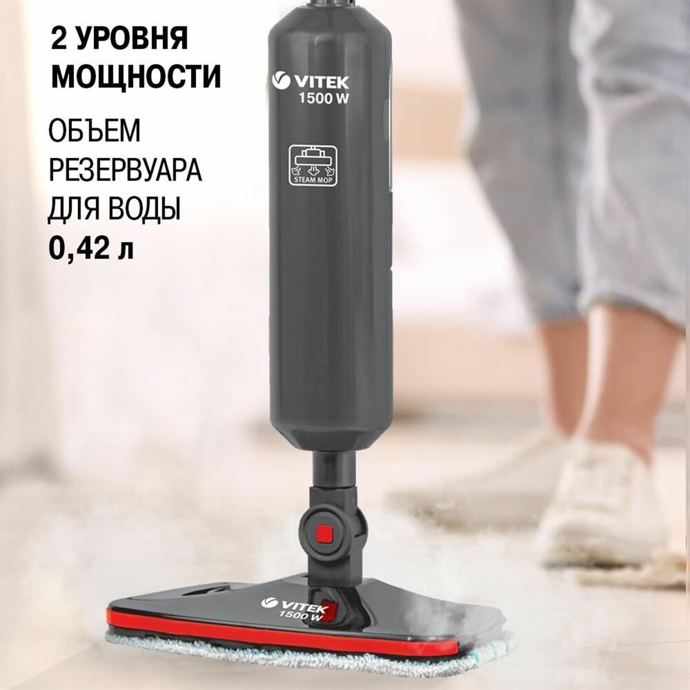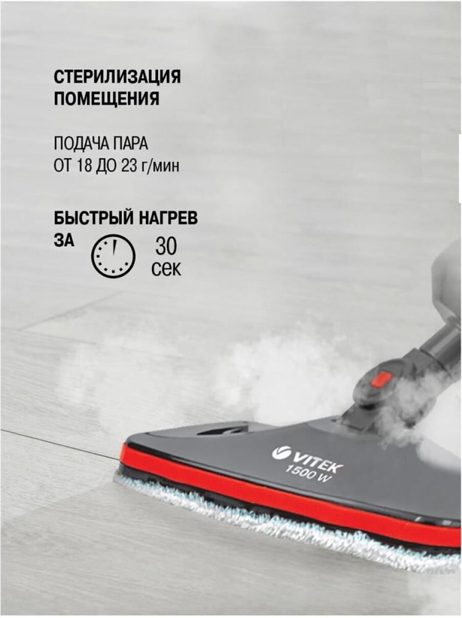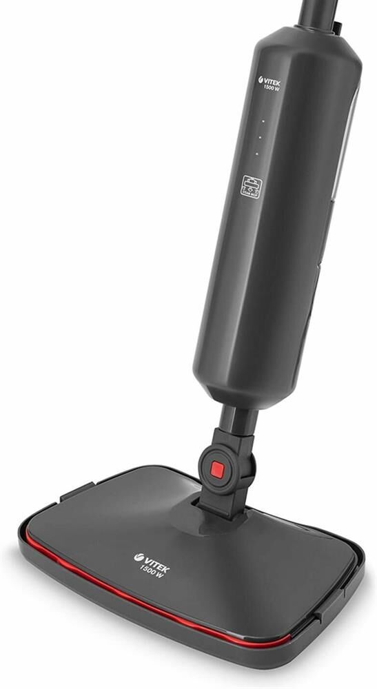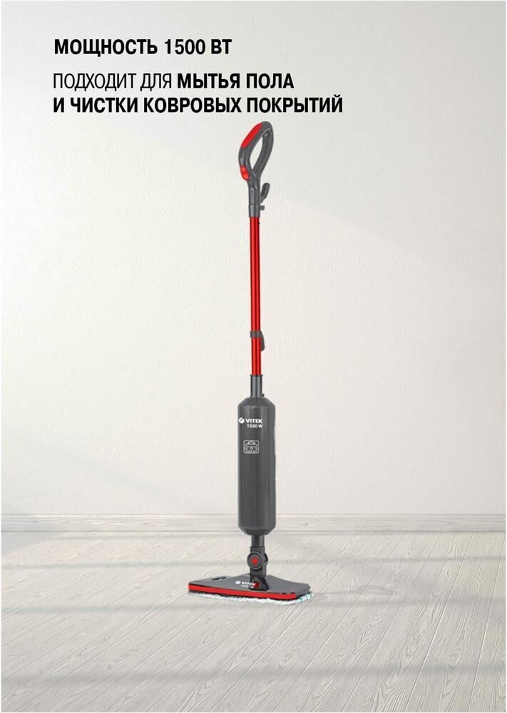 Паровая швабра. Максимальная мощность: 1500 Вт, Время разогрева: 25-30 секунд, Объем резервуара для воды: 0,42 литра, Подача пара: 18-23 г/минут, Съемная ручка, Фильтр для воды, Длина сетевого шнура:4 метра, Номинальная мощность: 1300 Вт, Уровни мощности: 2, Цвет: Графит/красный