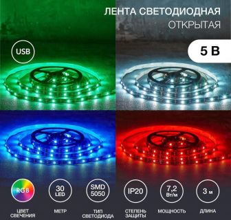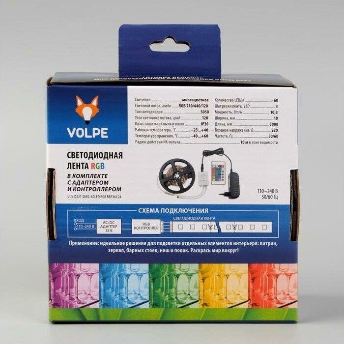 Комплект светодиодной ленты 3м. IP20. RGB. Адаптер 36Вт. Контроллер с пультом. Входное напряжение, В - 110-240; Диапазон рабочих температур, °С - от -25 до +40; Длина, м - 3; Класс энергопотребления - A; Количество светодиодов, led/m - 60; Минимальная партия - 1; Мощность, Вт/м - 10,8; Свет - RGB; Световой поток, Лм/м - 200/440/120; Срок гарантии, мес. - 12 месяцев; Срок годности - не ограничен; Срок службы, ч - 30000; Тех.группа (для внутреннего использования) - Ленты светодиодные и аксессуары к ним; Тип ленты - 5050; Угол светового потока, ° - 120; Частота, Гц - 50-60; Шаг резки, мм - 50; Ширина изделия, мм - 10