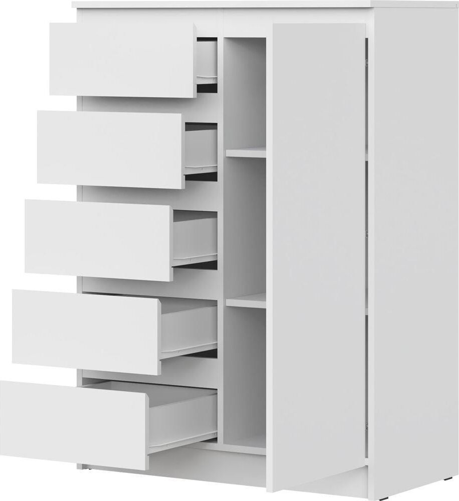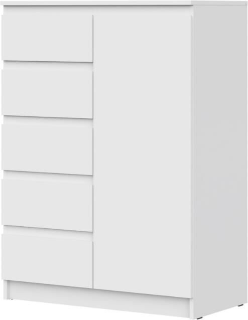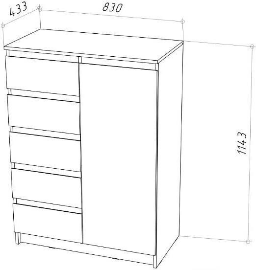 Удобный комод с 5 выдвижными ящиками и дверцой освободит место в квартире, позволяя удобно разместить предметы. Корпус и фасад изготовлены из ЛДСП 16 мм. Три цвета на выбор - Белый, Дуб Сонома, Дуб Вотан. Размер изделия (ШхВхГ) 83 х 114,3 х 43,3 см.