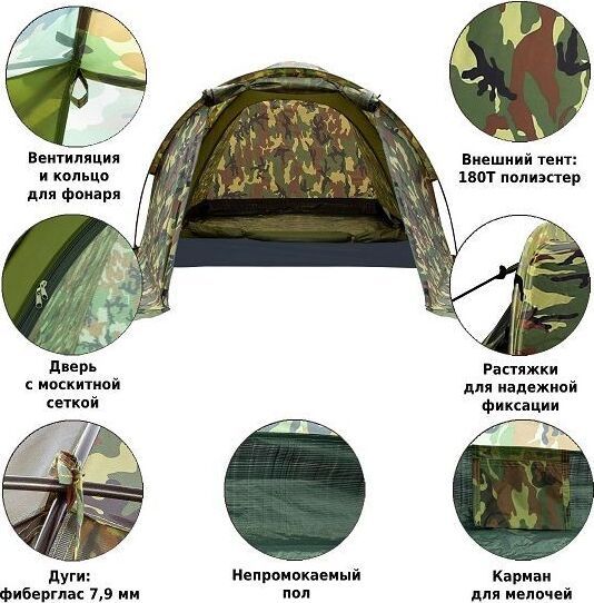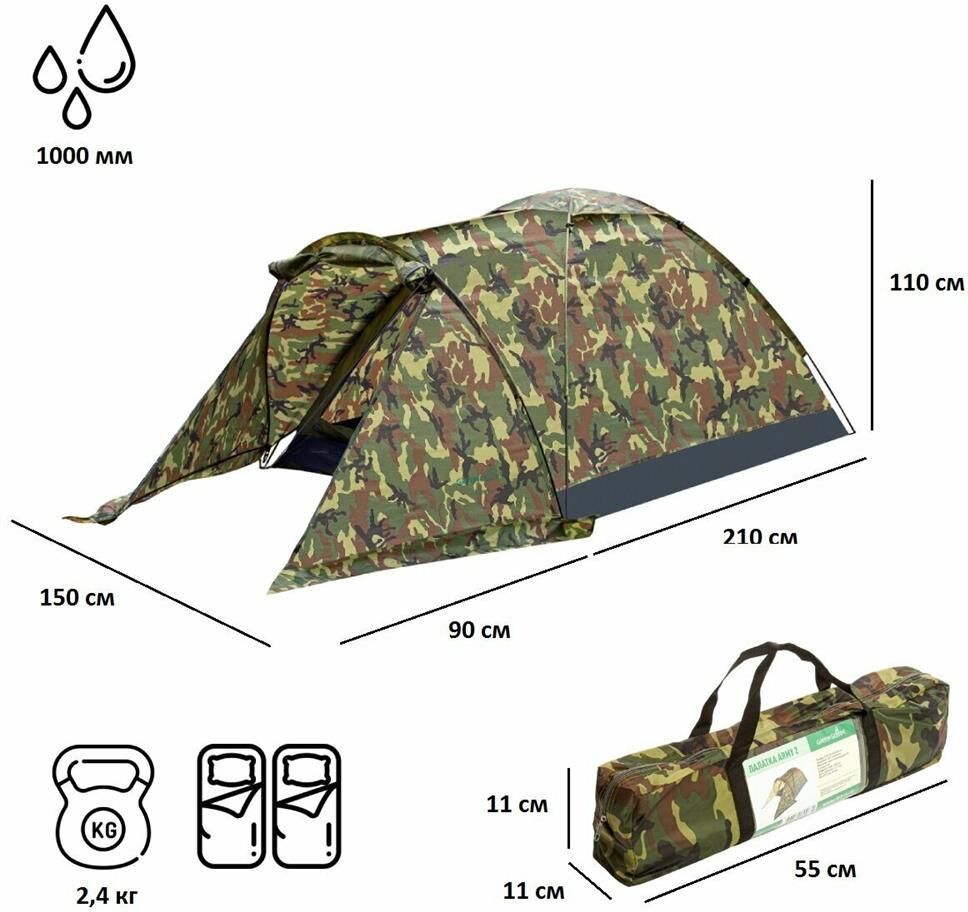 Палатка Green Glade Army 2 пригодится на пляже или во время отдыха на природе. Тент защитит от солнечных лучей в жаркий день. Палатка очень компактная и легкая, поэтому ее удобно брать с собой. Сборка происходит буквально за несколько минут. • Размер (ДхШхВ): (210+90)х150х110 см • Внешний тент: 180Т полиэстер • Водяной столб: 1000 мм • Дуги: фиберглас 7,9 мм • Размер индивидуальной упаковки: 55х11х11 см • Вес нетто: 2,4 кг • Количество штук в коробке: 6 штук • Вес брутто: 15,24 • Производитель: Green Glade