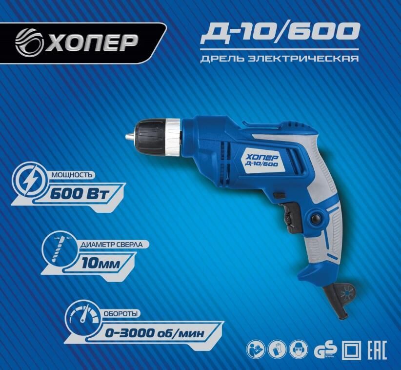 Рег.оборотов 0-3000об/мин, 600Вт, мах ф сверла 10мм, коробка