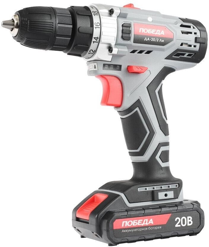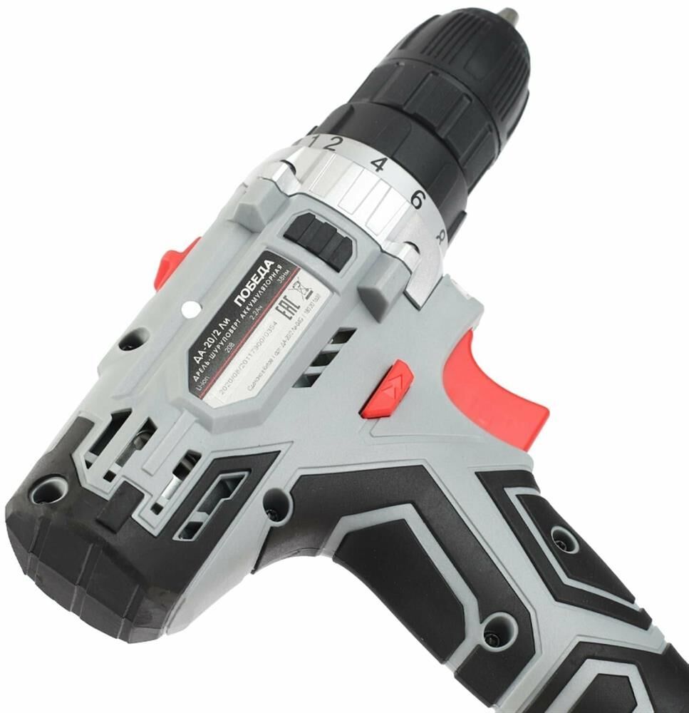 Тип аккумулятора: Li-ion • Напряжение аккумулятор: 20 В • Емкость аккумулятор: 2.2 А/ч • Тип патрона: быстрозажимной • Макс. размер зажимаемой оснастки: 10 мм • Количество скоростей: 2 • 1 скорость: 0-400 об/мин • 2 скорость: 0-1490 об/мин • Число ступеней крутящего момента: 18+1 • Мягкий крутящий момент: 30 Нм • Жесткий крутящий момент: 38 Нм • Регулировка скорости: есть • Наличие реверса: есть • Блокировка шпинделя: есть • Наличие подсветки: есть • Прорезиненная рукоятка: есть • Время зарядки аккумулятора: 1 час • Система защиты аккумулятора: есть • Кол-во аккумуляторов в комплекте: 2 • Гарантия: 1 год • ВхШхГ упаковки: 22х25,5х9 см • Вес брутто упаковки: 2,1 кг • Объем упаковки: 0,005049 куб. м • Комплект поставки: дрель-шуруповерт аккумуляторная, аккумулятор: 2 шт., зарядное устройство, двусторонняя бита, кейс, инструкция