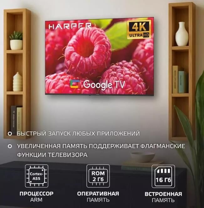 Диагональ экрана 60" (152 см); 4K QLED; Разрешение экрана 3840х2160; Смарт: Official Google Аndroid TV, Память: 2GB-RAM/16GB-ROM; Частота кадров 60/120 Гц, Dolby audio, Аудио: 20(2х10)Вт, Голосовой помощник, Функция поиска пульта, Цифровой тюнер DVB-T/T2/C/S2; Bluetooth 5.1, Wi-Fi 2.4/5 ГГц, Безрамочный дизайн, Матовый экран без бликов и отражений, Декодеры стереозвука NICAM, А2, АСЗ; Формат изображения: 16:9; Динамический контраст 1200:1; Яркость 330 кд/м2; Угол обзора (гор/верт) 178°/178°; Цифровой 3D фильтр; Количество цветов 1 млрд.; Время отклика 8 мс; Меню на русском, английском языках; Телетекст; Входы/выходы: Антенный вход, Вход для спутниковой антенны, Композитный видео/аудио вход, 3х HDMI (1.4/2.0), 2 х USB (2.0), S/PDIF (Оптический), LAN, CI слот. Размеры с подставкой: 1345х858х300 мм; Размеры без подставки: 1345х785х88 мм ; Вес: 11,9кг; VESA: 200х200; Габариты в упаковке: 1465x890x125 мм; Вес в упаковке: 16,1кг