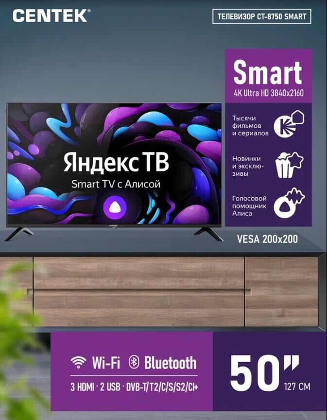 Диагональ 50’’ (4K). Разрешение 3840 х 2160. Контрастность 5000:1. Smart TV Есть. Яркость 250 кд/м2. Операционная система Android 11.0 (Yandex OS). Пульт ДУ С голосовым управлением. HDR Есть. Мощность 130 Вт. Мощность динамиков 10 Вт + 10 Вт. Угол обзора (L/R) 170 /170. Крепление монтажа VESA 200 x 200. Входы и выходы 3хHDMI, 2хRF, COAX, mini AV, 2хUSB, CI, LAN. Функции CEC, Родительский контроль, Спящий режим. Особенности Dolby/dolby+ surround, Динамическое шумоподавление, Мультиэкран, Таймер сна.