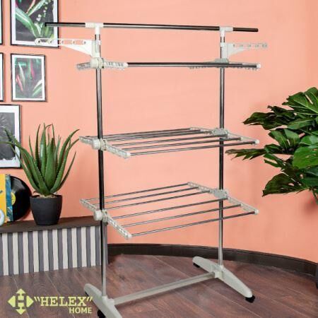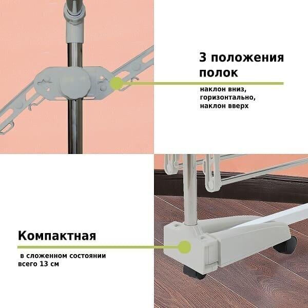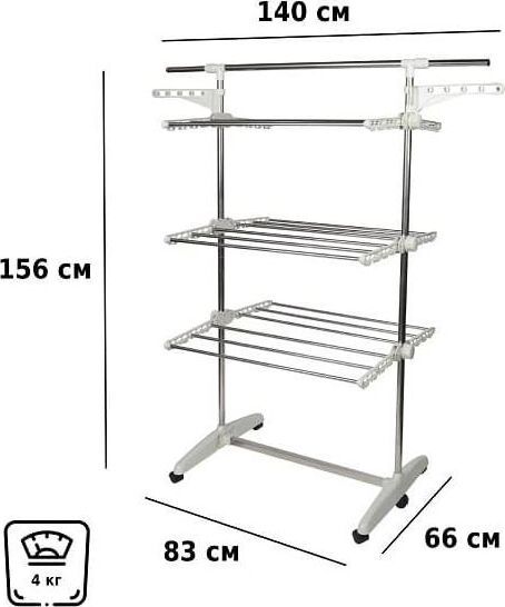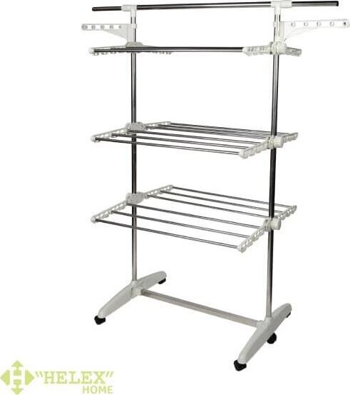 для обуви. Благодаря колёсикам в комплекте, сушилка очень мобильная, ее можно легко переместить с одного места на другое. Ярусы для сушки складные, поэтому сушилка не будет занимать много места. Отлично подойдет в помещениях с ограниченным пространством. Идеально подходит для ванных комнат и даже балконов. • Размер разложенный: 83-140х66х156 см • Размер сложенный: 78,8х13х153,3 см • Материал: металлическая труба 25/22/11 мм, ABS-пластик • Цвет: белый • Опции: 3 уровня, 6 полок (снимаемые), складывающееся основание • Колёса: 6 штук • Длина сушильной поверхности: 14,5 м • Максимальная распределённая нагрузка: 50 кг • Размер упаковки: 79х33х16 см • Количество в упаковке: 1 шт • Вес нетто: 4 кг • Вес брутто: 5 кг • Производитель: Helex • Страна: Китай
