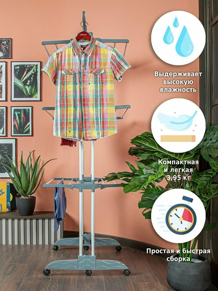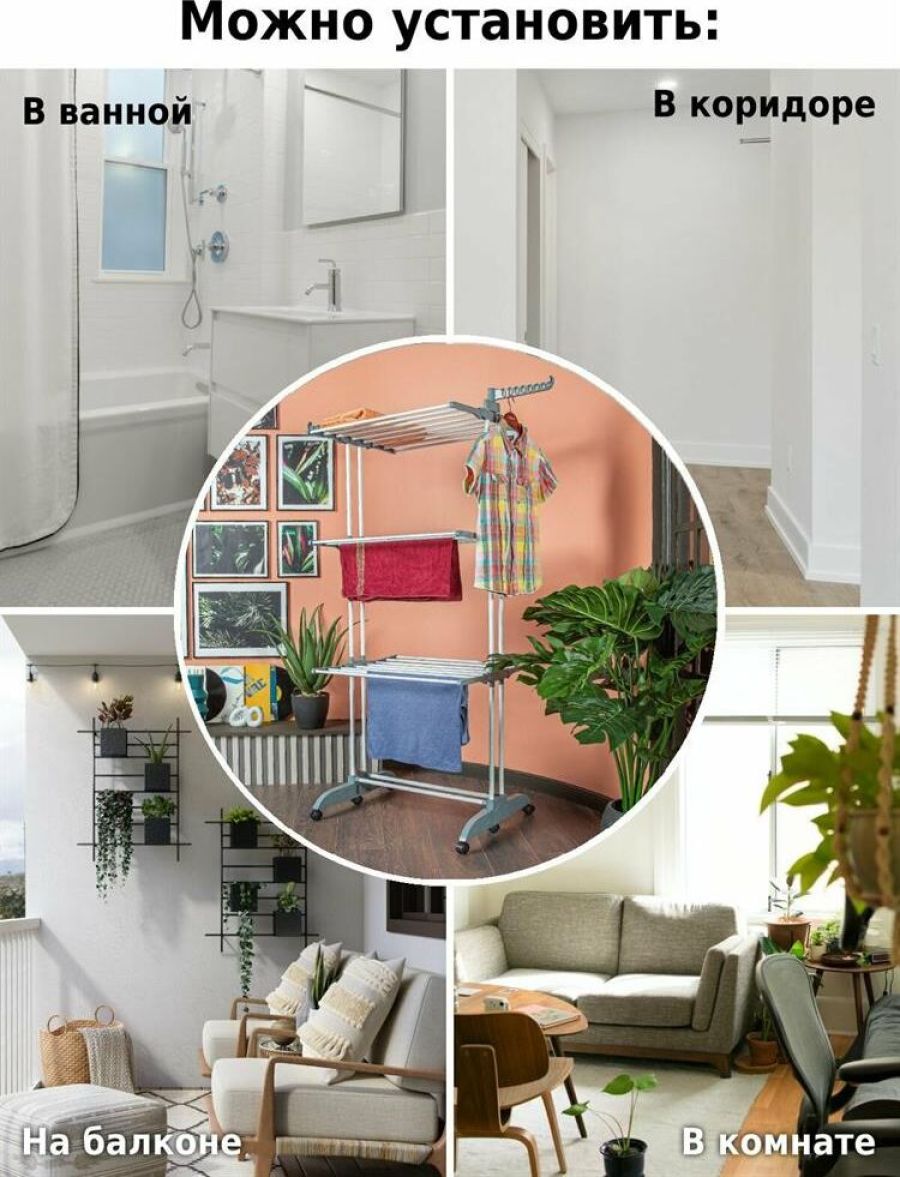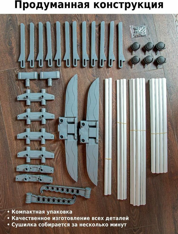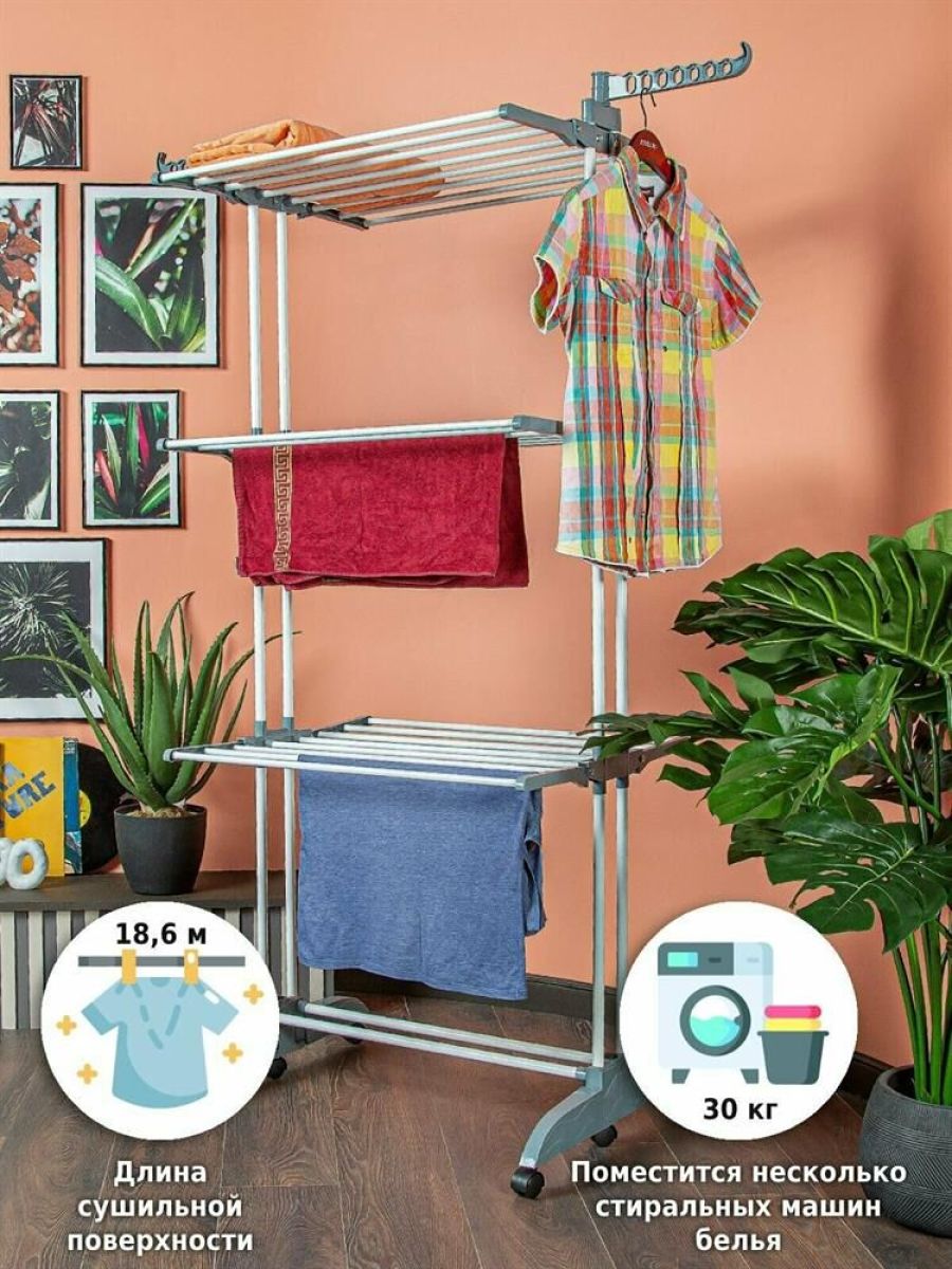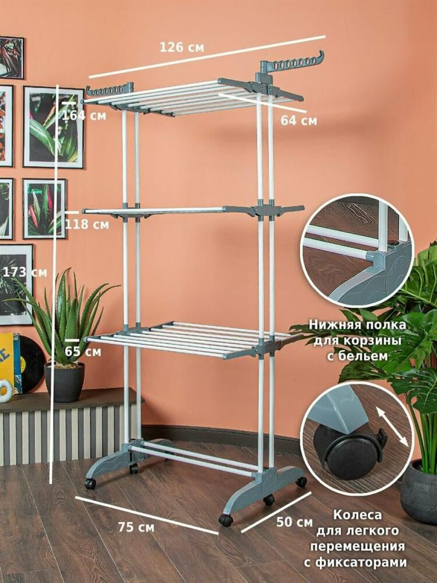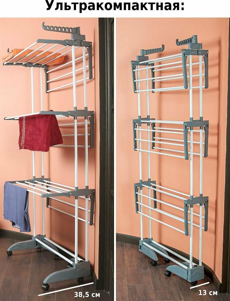 Многофункциональная напольная сушилка для белья Helex — незаменимая вещь в любом доме. Имеет три яруса для сушки белья, дополнительные крючки позволяют сушить одежду прямо на плечиках, имеется подставка для обуви. Благодаря колёсикам в комплекте, сушилка очень мобильная, ее можно легко переместить с одного места на другое. Ярусы для сушки складные, поэтому сушилка не будет занимать много места. Отлично подойдет в помещениях с ограниченным пространством. Идеально подходит для ванных комнат и даже балконов. • Размер разложенный: 75-126х64х170 см • Размер сложенный: 75х13х173 см • Материал: металлическая труба 19мм/13мм; полипропилен • Цвет: белый + серый • Опции: 3 уровня, 6 полок (снимаемые), складывающееся основание • Колёса: 6 штук • Длина сушильной поверхности: 1860 см • Максимальная нагрузка: 30 кг • Размер упаковки: 80х20х13 см • Количество в упаковке: 1 шт • Вес нетто: 3,95 кг • Вес брутто: 4,1 кг • Производитель: Helex • Страна: Китай