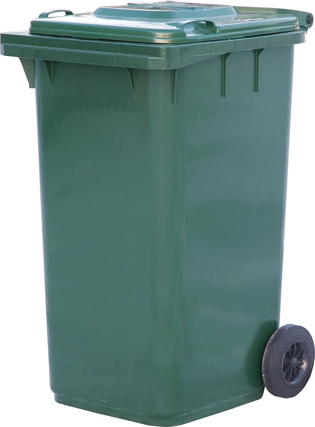 Мусорный контейнер 240л. Зеленый. Пластиковый контейнер для мусора на 2-х колёсах, с крышкой. Для сбора бытовых отходов. Максимальная загрузка 120 кг. Усиленное дно. Обрезиненные колёса. Металлическая ось. Усиленная передняя стенка для работы с мусоросборочной техникой.