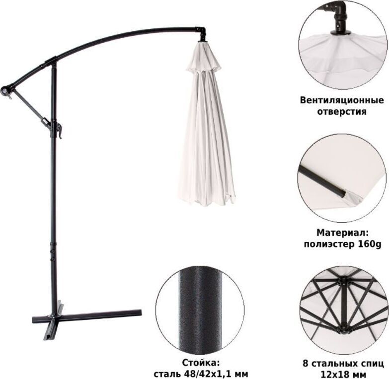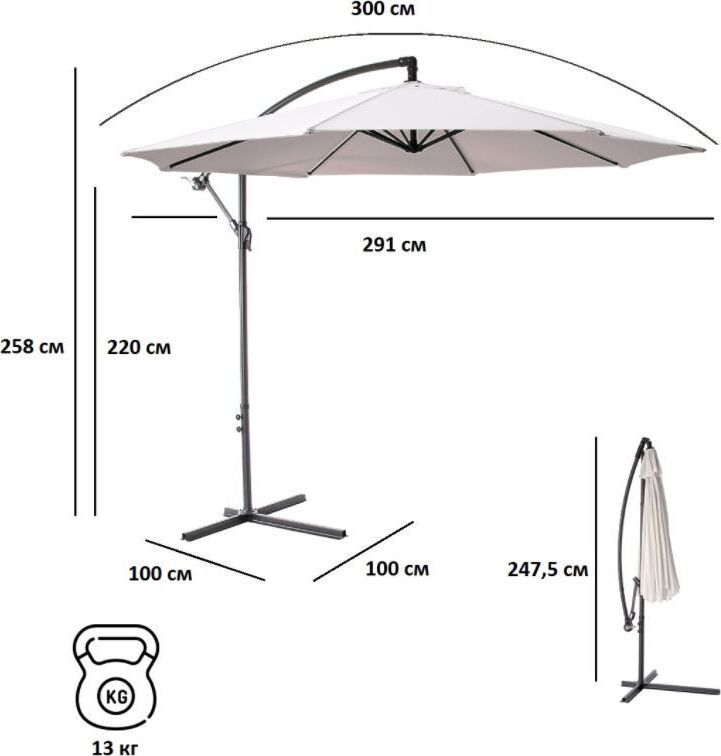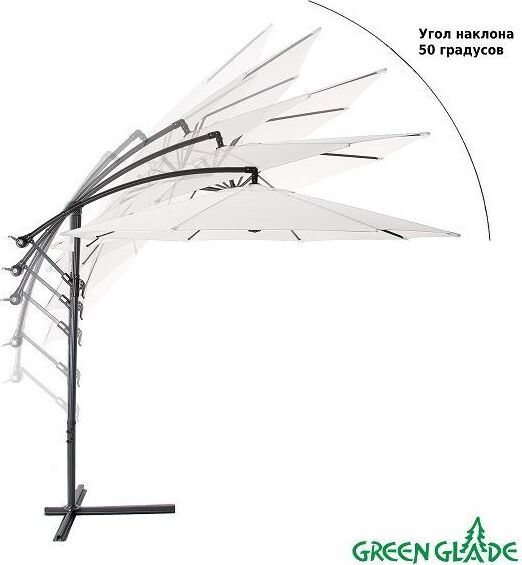 Большой зонт Green Glade – незаменим для отдыха на даче, загородном участке и около бассейна. Он защитит вас и ваших детей от яркого солнца и создаст комфортную тень. Купол зонта легко открывается с помощью лебедки. Благодаря боковому расположению стойки под куполом можно установить любую пластиковую мебель: от шезлонга до обеденного стола. В комплекте с зонтом идет основание – крестовина, на которую для устойчивости можно установить бетонные утяжелители (в комплект не входят) или привернуть ее через имеющиеся отверстия к полу. • Длина дуги купола: 300 см • Диаметр: 291 см • Высота (общая/до купола): 258/220 см • Высота в сложенном состоянии: 247,5 см • Вес нетто: 13 кг • Стойка: стальная 48/42x1,1 мм • Количество спиц: 8 штук, сечение 12х18 мм • Макс.угол наклона - 50* • Размер крестовины: 100х100 см • Материал: полиэстер 160g • Цвет: серый • Размер коробки: 199 x 30 x 14см • Количество в коробке: 1 штука • Вес брутто: 15 кг • Производитель: Green Glade • Страна: Китай
