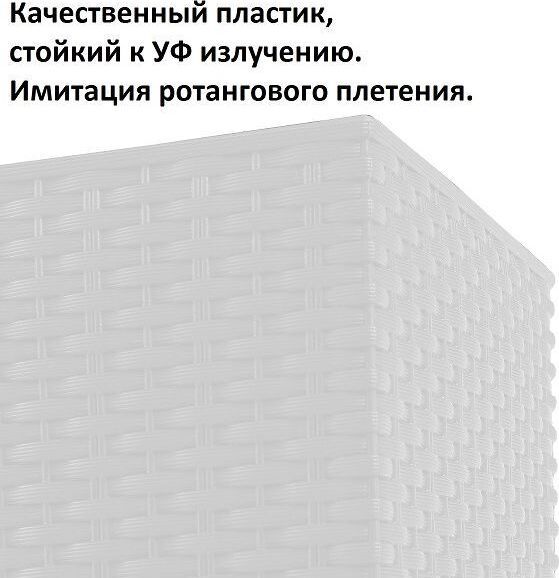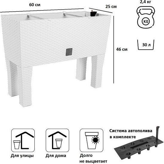 Кашпо с автополивом Rato Case High является замечательным украшением садового интерьера, дома, зоны отдыха. Изделие выполнено с имитацией под натуральный ротанг и имеет две устойчивые ножки, что делает его стильным элементом декора. В комплект кашпо с автополивом Rato Case High входит 2 предмета: декоративная емкость и специальная система автополива, которая поможет заботить о растениях с еще большим удовольствием. • Комплектация: 2 предмета (система автополива + декоративная емкость) • Размер (ДхШхВ): 600х250х460 мм • Объемы: 30 л • Цвет: белый • Материал: пластик + имитация ротанга • Вес брутто: 2,4 кг (1,52 кг + 0,3 г + 0,58 кг (ножки)) • Количество в упаковке: 3 штуки • Производитель: Prosperplast • Страна: Польша