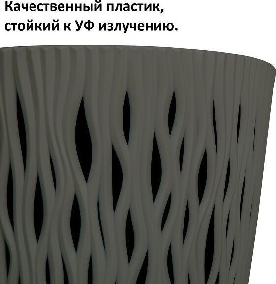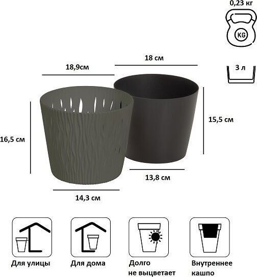 Кашпо для цветов Sandy Round является замечательным украшением садового интерьера, дома, зоны отдыха. Благодаря прочному пластику изделие обладает устойчивостью к ультрафиолетовым лучам. Кашпо для цветов Sandy Round состоит из двух предметов: внутренней емкости, куда сажают растение, и декоративной емкости. • Комплектация: 2 предмета (внутренняя емкость + декоративная емкость) • Размер (ДМхВ): 189х165 мм • Объемы: 3 л • Цвет: серый • Материал: пластик • Вес брутто: 0,225 кг • Количество в упаковке: 5 штук • Производитель: Prosperplast • Страна: Польша