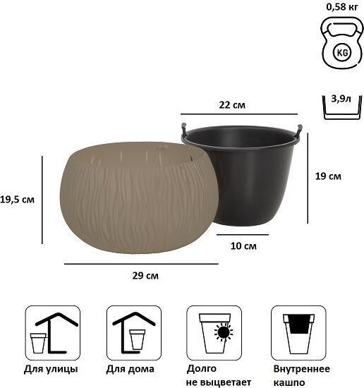 Кашпо для цветов Sandy Bowl является замечательным украшением садового интерьера, дома, зоны отдыха. Оно обладает повышенной стойкостью к высоким и низким температурам, а также к различным механическим повреждениям. Кашпо для цветов Sandy Bowl состоит из двух предметов: внутренней емкости, куда сажают растение, и декоративной емкости. • Комплектация: 2 предмета (внутренняя емкость + декоративная емкость) • Размер (ДМхВ): 290х190 мм • Объемы: 3,9 л • Цвет: мокко • Материал: пластик • Вес брутто: 0,58 кг • Количество в упаковке: 4 штуки • Производитель: Prosperplast • Страна: Польша