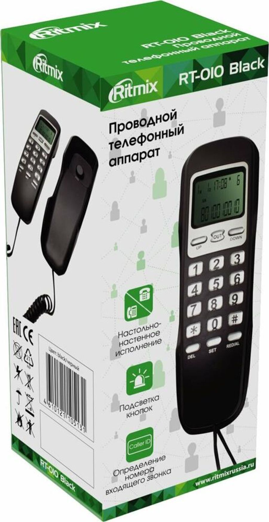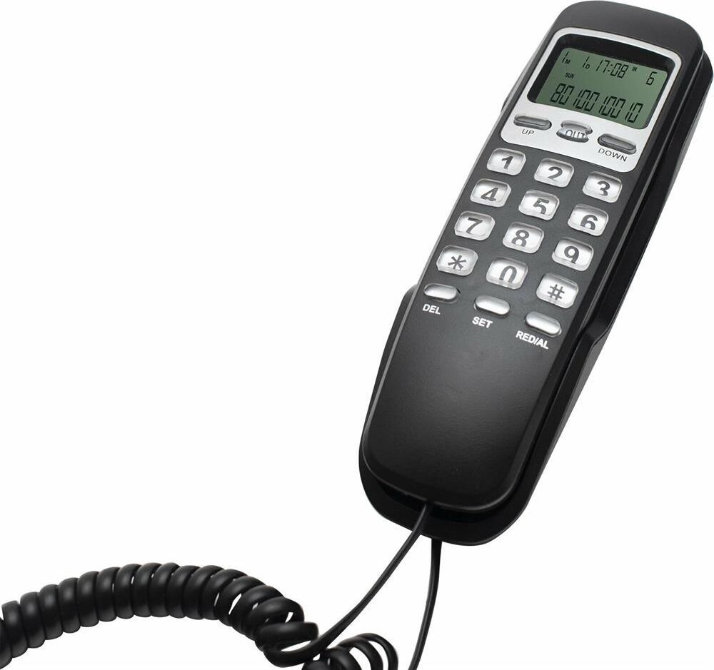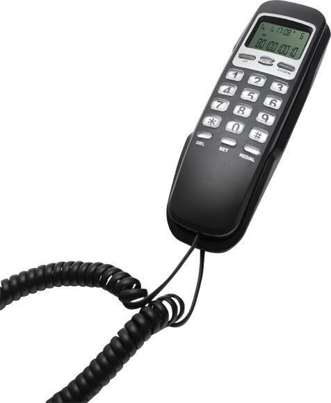 Проводной телефон с дисплеем, узкий корпус. Кнопки набора номера на базе. Пауза/ Повтор набора номера. Переключение. Системы определения номера входящего звонка (Caller ID), 32 входящих, 16 исходящих номеров в памяти. Импульсного /Тонового набора номера. Настольное и настенное крепление.