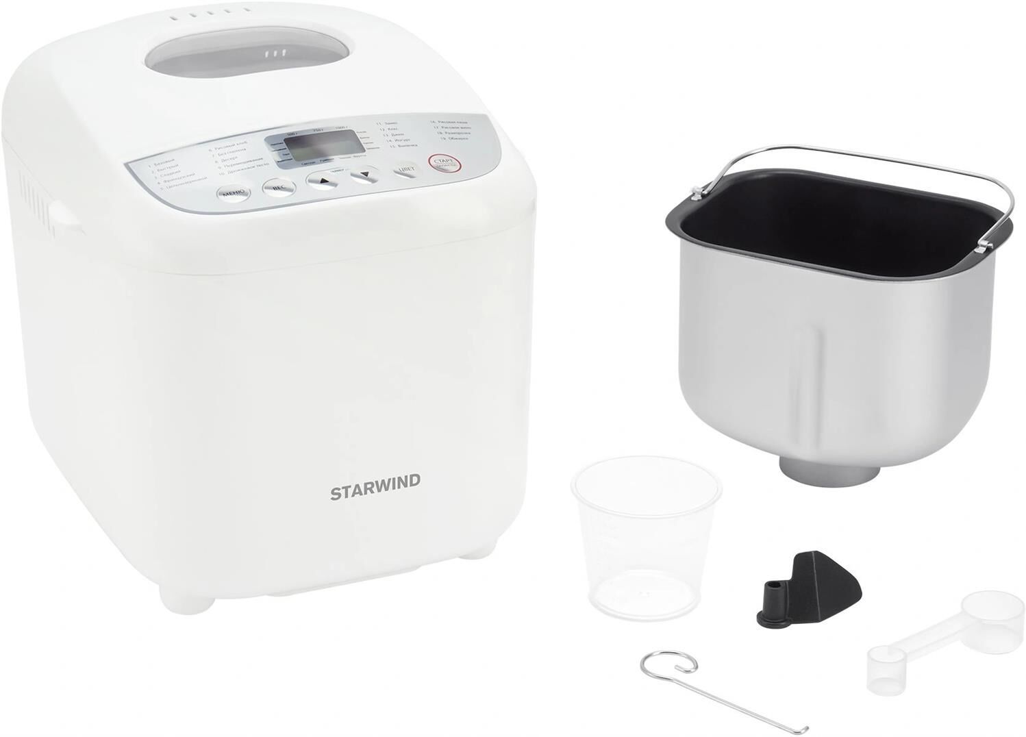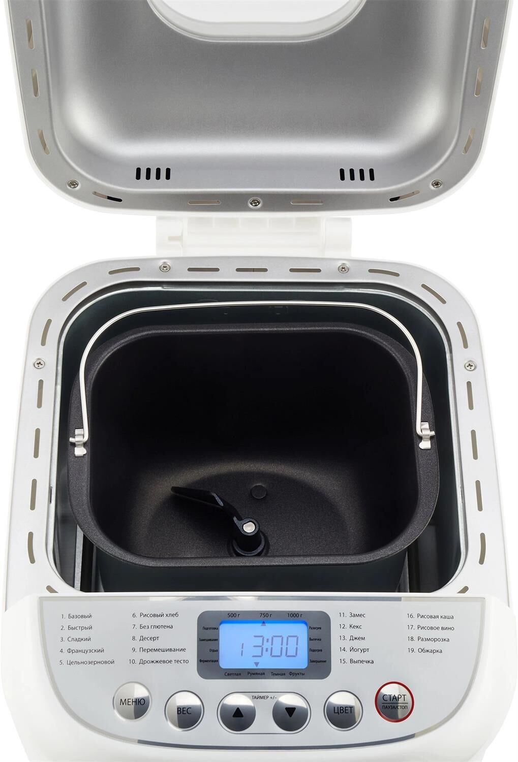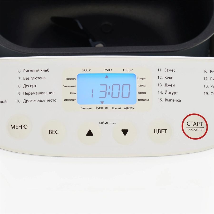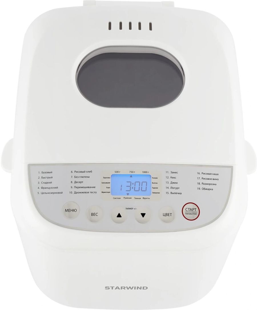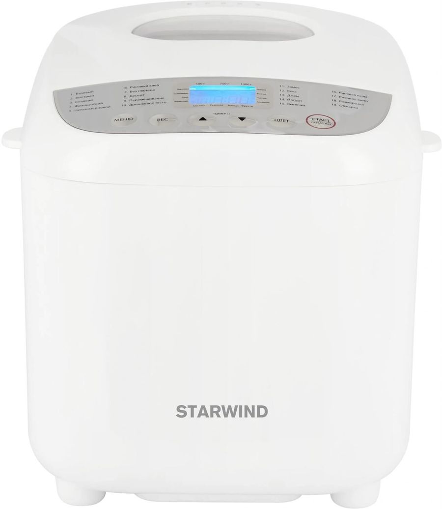 Мощность 600 Вт. Максимальный вес выпечки 1000 г. Формы выпечки: буханка. Количество размеров выпечки 500/750/1000. Программ приготовления 19. Функции: выбор цвета корочки, поддержание температуры, регулировка веса выпечки, таймер отсрочки старта. Материал корпуса: пластик. Цвет белый Дополнительный цвет серебристый. Гарантия 12 мес.
