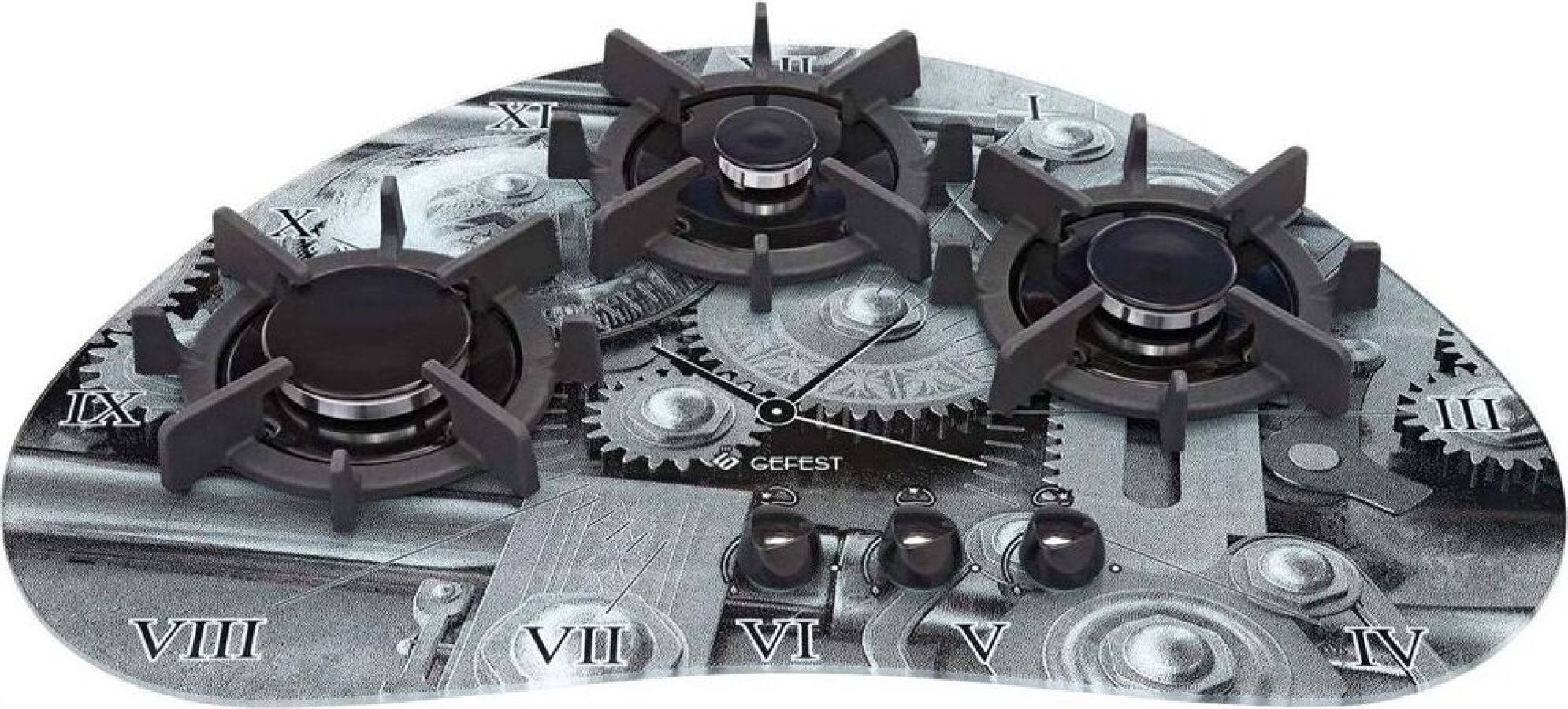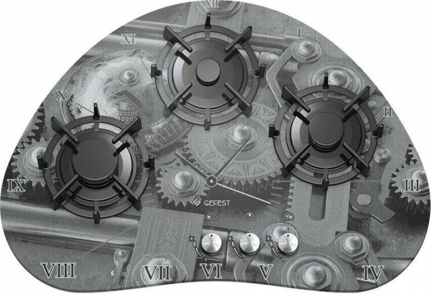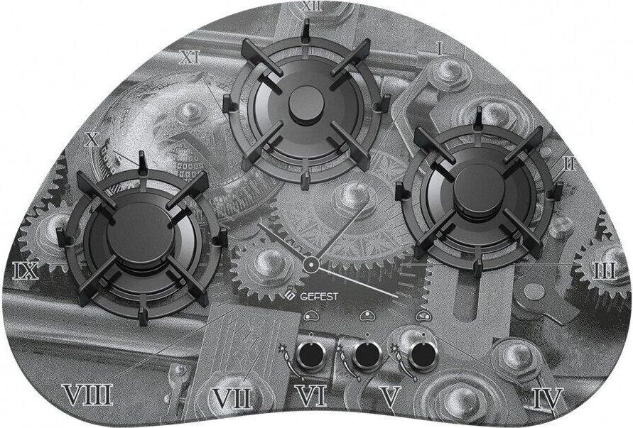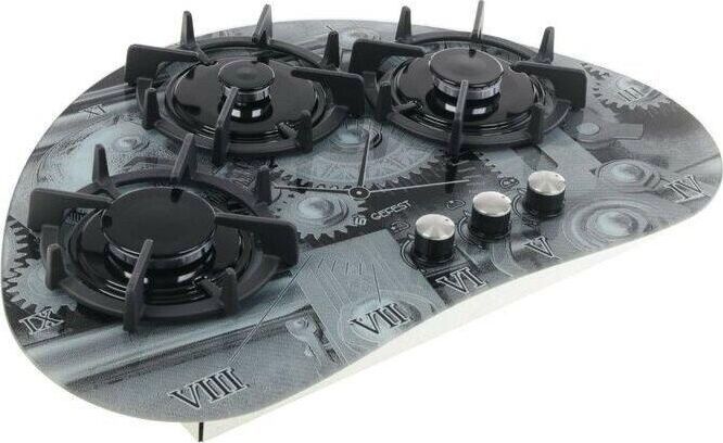 Габариты (ВхШхГ) 10,2х73,3х50см. 3 конфорки. Переключатели поворотные. Электророзжиг от отдельной кнопки. Фиксированное положение «малое пламя». Система «газ-контроль». Варочная поверхность: стеклянная. Чугунные решетки стола.