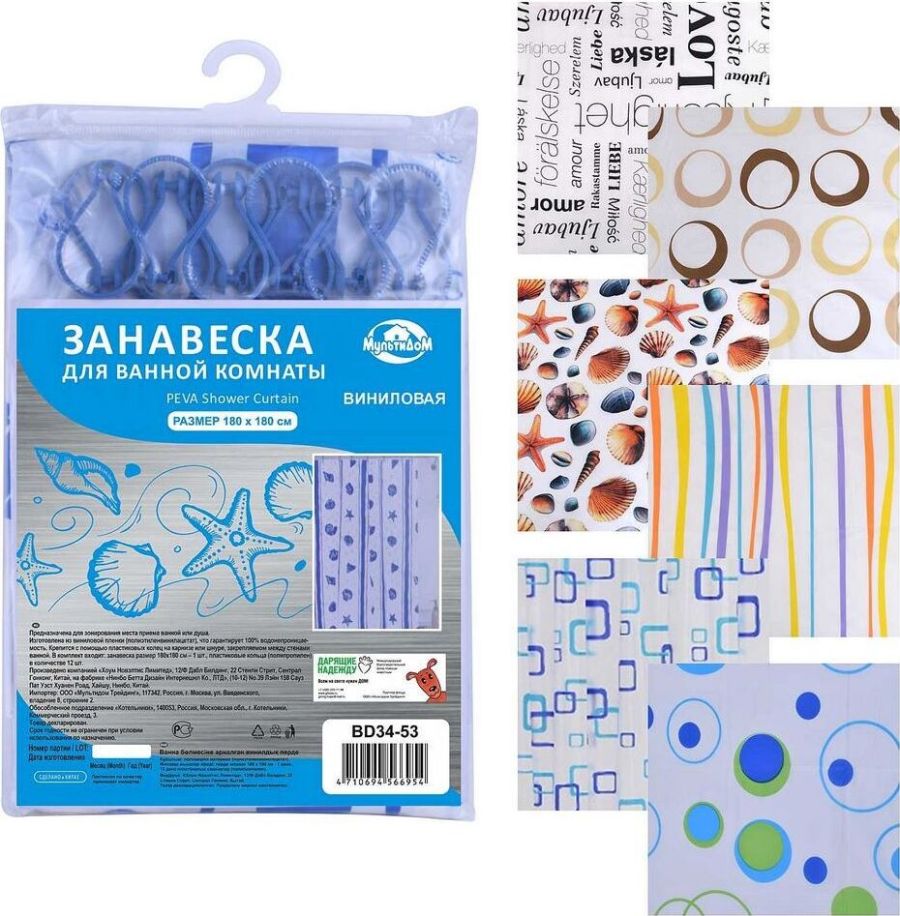 Занавес д/ван. винил 180x180 см BD34-53 Материал: Пластмасса (PEVA) В комплект входит: занавеска размер 180х180см – 1шт., пластиковые кольца (полипропилен) в количестве 12шт. Размер 180х180 см.