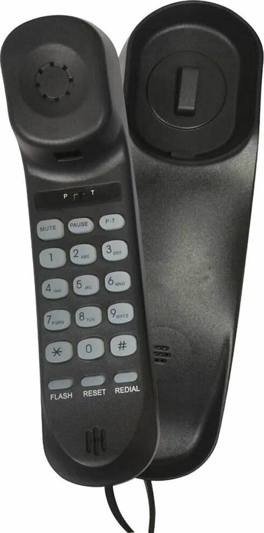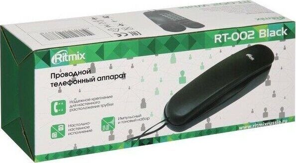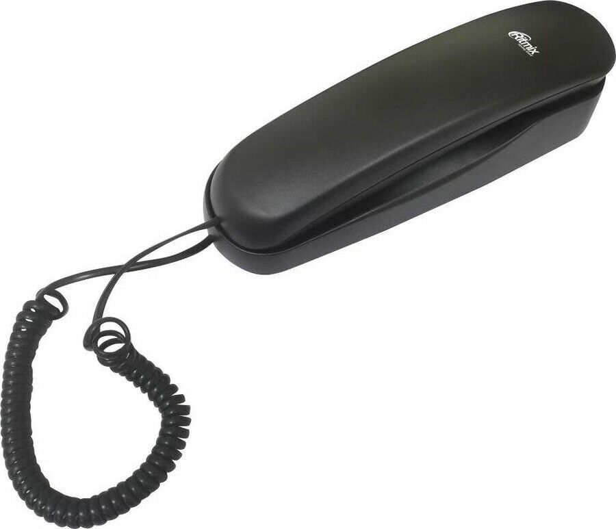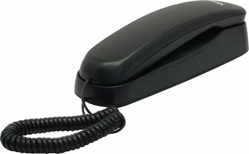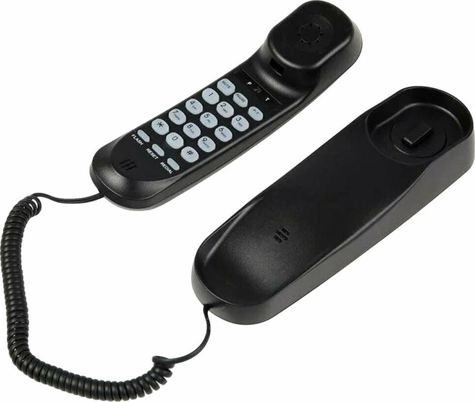 Проводной телефон, узкий корпус. Кнопки набора номера на трубке. Большие цифры на кнопках. Сброс/ Пауза/ Повтор номера. Регулировка громкости звонка. Переключение Импульсного/ Тонового набора номера (по умолчанию импульсный). 3 однокнопочных набора номера. 10 двухкнопочных наборовномера в памяти. Настольное и настенное крепление.