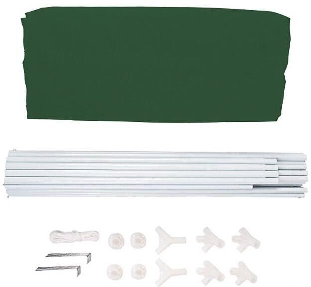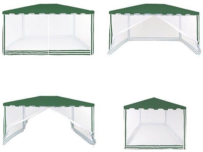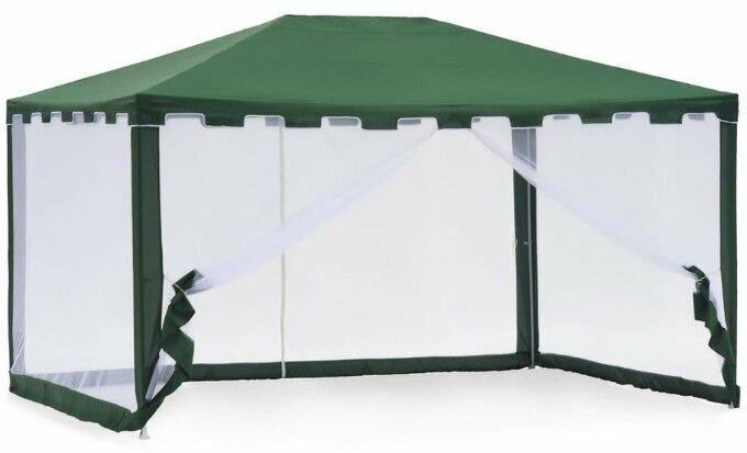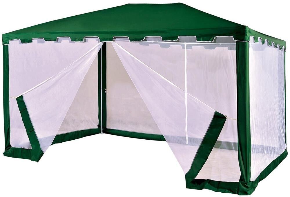 Тент садовый из полиэстера – практичное и популярное решение для использования на даче, пикниках, шашлыках и кемпинге. Крыша тента защитит от солнца, а москитные сетки избавят от насекомых. Тент садовый из полиэстера быстро и несложно монтируется и закрепляется с помощью растяжек. • Размер: 3х4х2,5 м • Цвет: зеленый • Материал: полиэстер 160 г • Каркас: металлическая трубка (19х19х25 мм) • Москитная сетка: да • Карниз: зубчатый • Вес брутто: 10 кг • Размер упаковки: 108х18х20 см