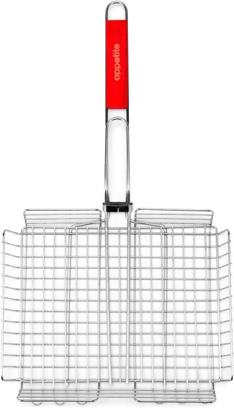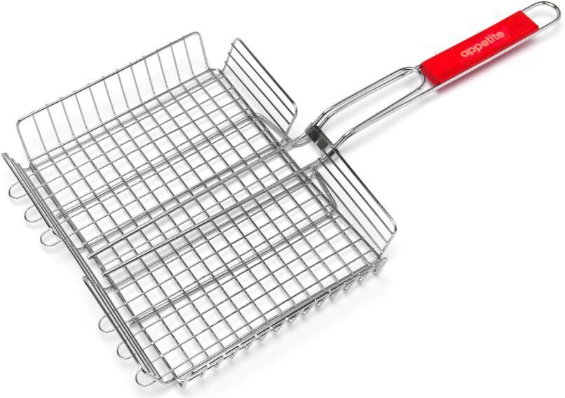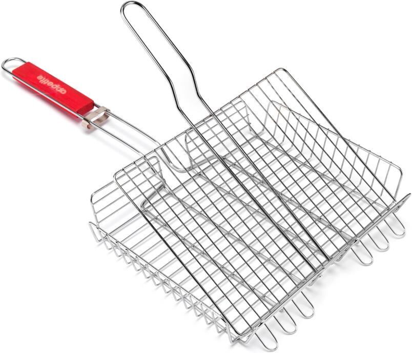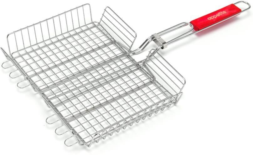 Хромированная сталь, кастомизированная деревянная ручка, длина рабочей поверхности 31,5см, ширина 26см, длина вместе с ручкой 58см, глубина 5см, толщина прута: 4,7мм / 3мм / 1,9мм
