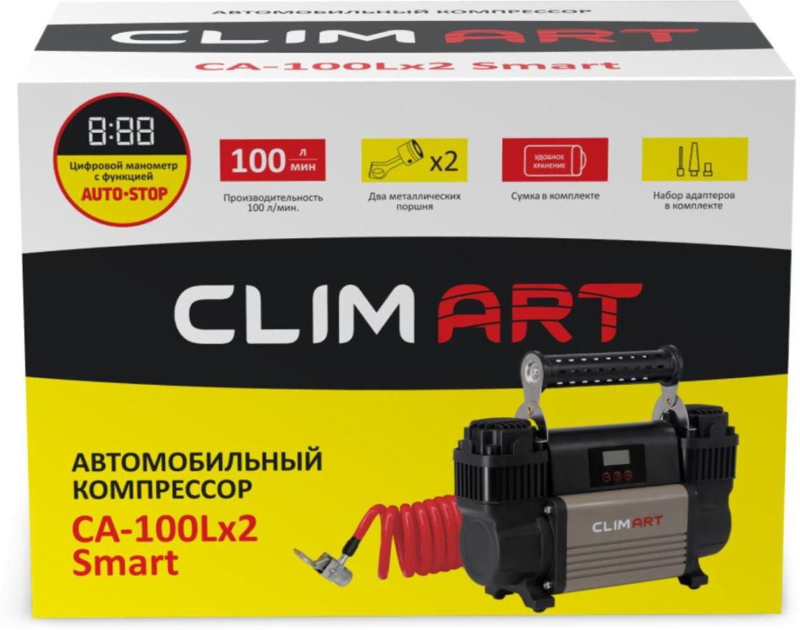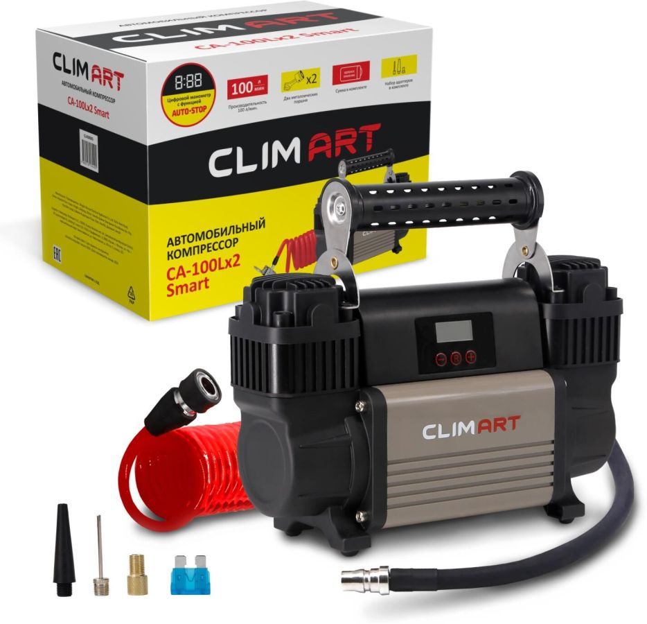 Автомобильный компрессор CLIMART СA-100L Smart – надежный помощник для любого автомобилиста. Компактное устройство предназначено для быстрой подкачки колес. Также с его помощью можно накачать резиновые матрасы, мячи и велосипедные шины – переходники входят в комплект. Высокоточный цифровой манометр позволяет задать одинаковое давление в шинах. Компрессор отличается простотой и надежностью конструкции, он способен проработать без перерыва до 30 минут. Корпус и поршневая группа устройства сделаны из металла, что обеспечивает его повышенную прочность и увеличенный ресурс. Питание прибора осуществляется от АКБ автомобиля. Предохранитель в капсуле защищает устройство и сеть автомобиля от скачков напряжения в случае нештатной работы компрессора. Удобная сумка позволяет компактно хранить компрессор в багажнике.