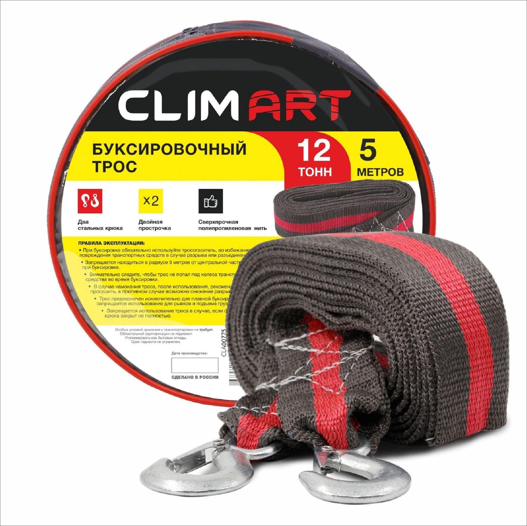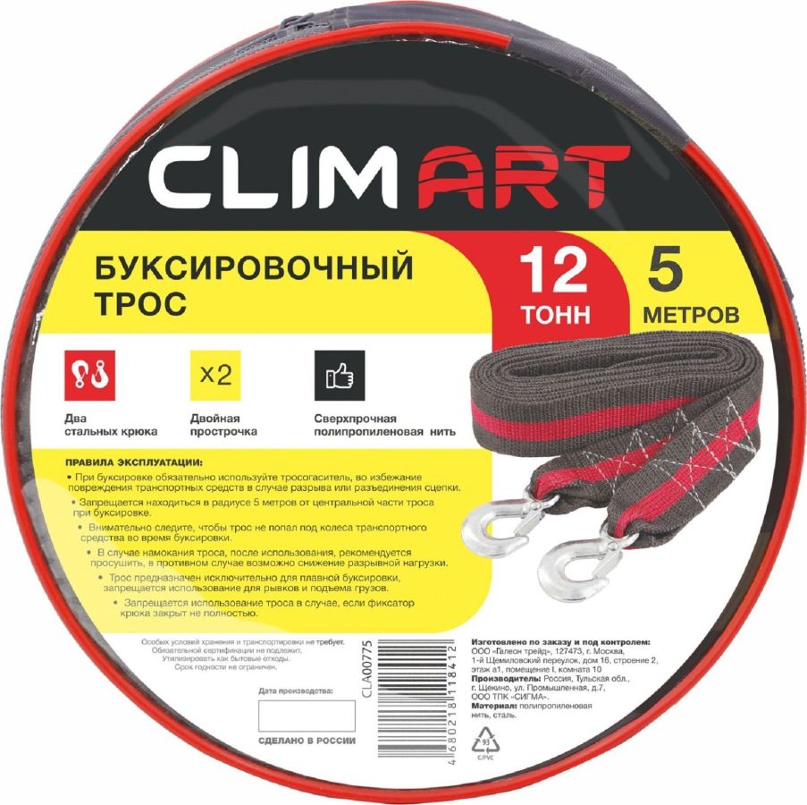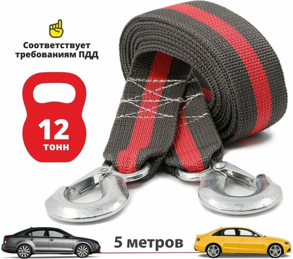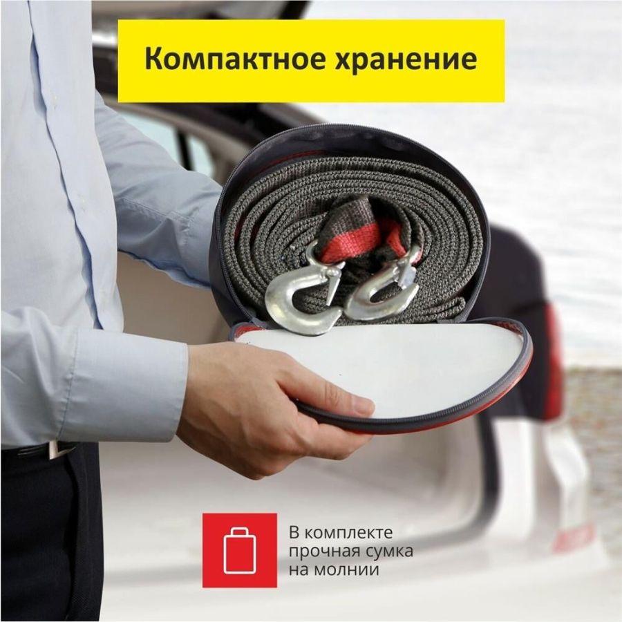 Трос буксировочный предназначен для перемещения автомобиля общей массой до 12 тонн. Длина: 5 м Цвет: серо-красный Материал: трос - полипропилен, крюки - сталь " Сверхпрочная полипропиленовая нить " Сумка в комплекте " Устойчив к воздействию влаги, нефтепродуктов " Морозоустойчив " Соответствует требованиям ПДД
