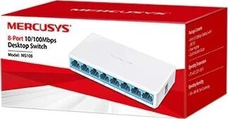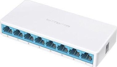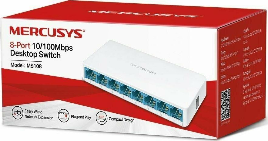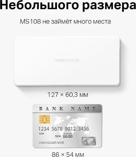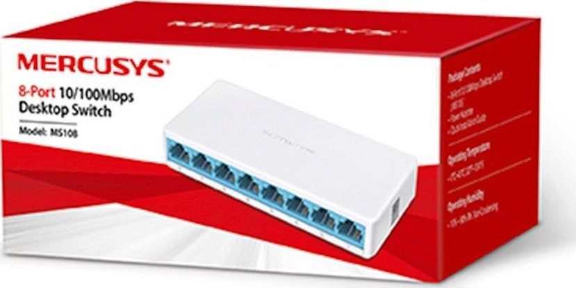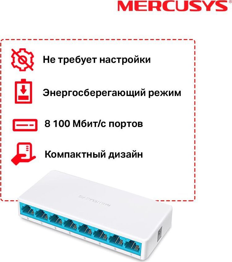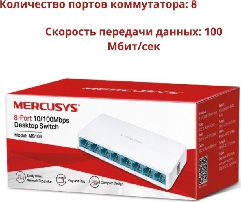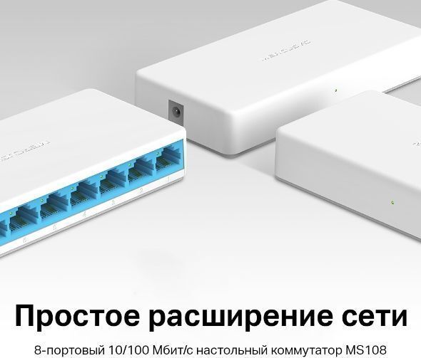 неуправляемый, настольный, порты 10-100Base-TX: 8 портов 10/100/1000 Мбит/с (RJ45) с автосогласованием и поддержкой Auto MDI/MDIX. Коммутатор Mercusys MS108 с легкостью объединит до 8 устройств с поддержкой сети 10/100 Мбит/сек в вашу локальную сеть. Он поддерживает стандарты: IEEE 802.3, IEEE 802.3u, IEEE 802.3x. Модель Mercusys MS108 имеет размеры 127x60x22 мм.
