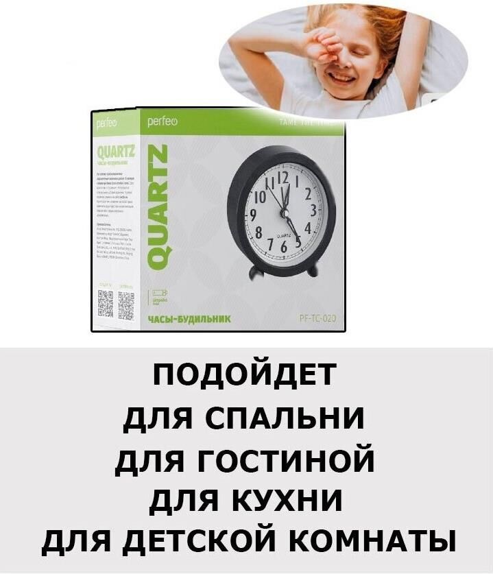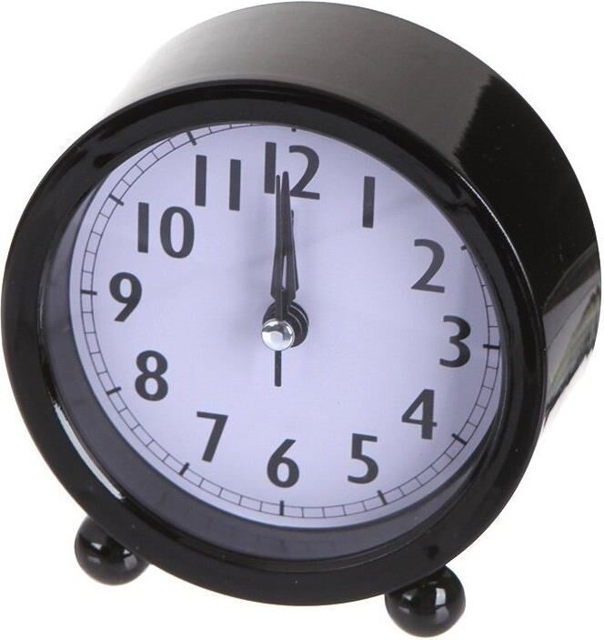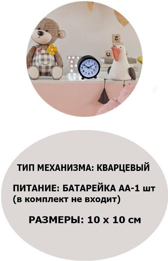 Материал корпуса: пластик; Форма: круг; Размер: 98х103х40 мм; Тип механизма: кварцевый; Тип элемента питания: АА; Количество элементов питания: 1; Будильник: есть