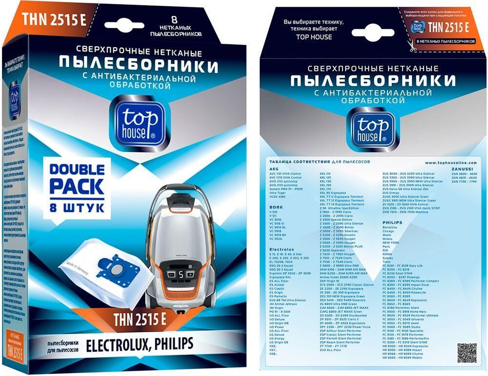 TOP HOUSE THN 2515 Е Сверхпрочные нетканые пылесборники с антибактериальной обработкой, 8 шт. для пылесосов ELECTROLUX: Airmax, Bolido, Clario, Clario-2, Classic Silence, Ergo Classic, Ergo Space, Essensio, Equipt, Excellio, Oxy3 system, Oxygen, Power Force, Silent Performer, Smartvac, JetMaxx, Ultra Ona, Ultra Silencer, Viva Control, Viva Quick Stop, MAXImus и тд. PHILIPS: Cityline, Expression, Impact, Impact Plus, Jewel, Mobilo, Specialist, Universe, Studio Power, Power Life, SmallStar, SilentStar, Home Hero, EasyLife, Performer, Performer Active, Performer Expert, Performer Pro. Соответствуют оригинальным типам пылесборников: s-bag, E 15, E 18, E 40/41, E 59, E 200 – 203 B, E 205/206 B, E 210 В, E 82, PH 86/96, VO 75. Изготовлены из многослойного нетканого материала Micro-Fleece на одном из лучших заводов в Германии - Aichner-Filter GmbH. Обеспечивают уровень фильтрации воздуха в 99,98%.