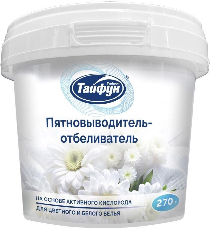ТАЙФУН Пятновыводитель отбеливатель 270 г. это эффективное средство на основе активного кислорода и энзимного комплекса для удаления всех видов пятен и отбеливания белья. Подходит для всех видов тканей кроме шерсти и шелка. Усиливает действие всех видов средств для стирки и подходит для всех типов стиральных машин и ручной стирки. Удаляет стойкие загрязнения и неприятные запахи. Не содержит отдушек, агрессивных ПАВ, хлора.