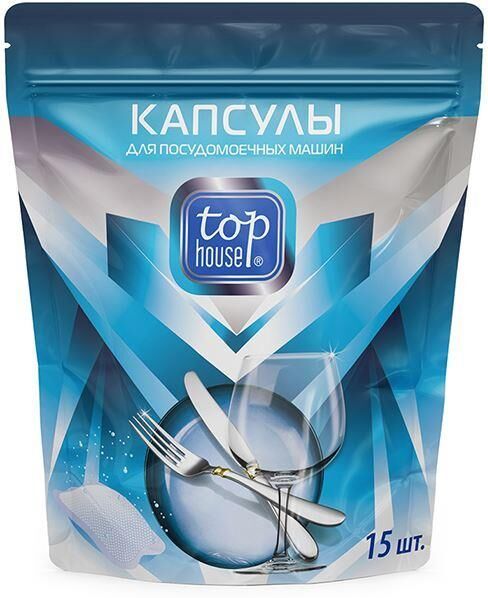 TOP HOUSE Капсулы для посудомоечных машин, 15 шт, эффективное средство, предназначенное для удаления стойких загрязнений. Капсулы для посудомоечных машин изготовлены по современной технологии с учетом рекомендаций ведущих производителей посудомоечных машин. Удаляют пригоревшие и засохшие загрязнения, жиры и крахмал, предупреждают образование известкового налета, быстро растворяются и бережно очищают посуду и столовые приборы. Капсулы удобны и безопасны, не содержат фосфатов, триазолов и отдушек.