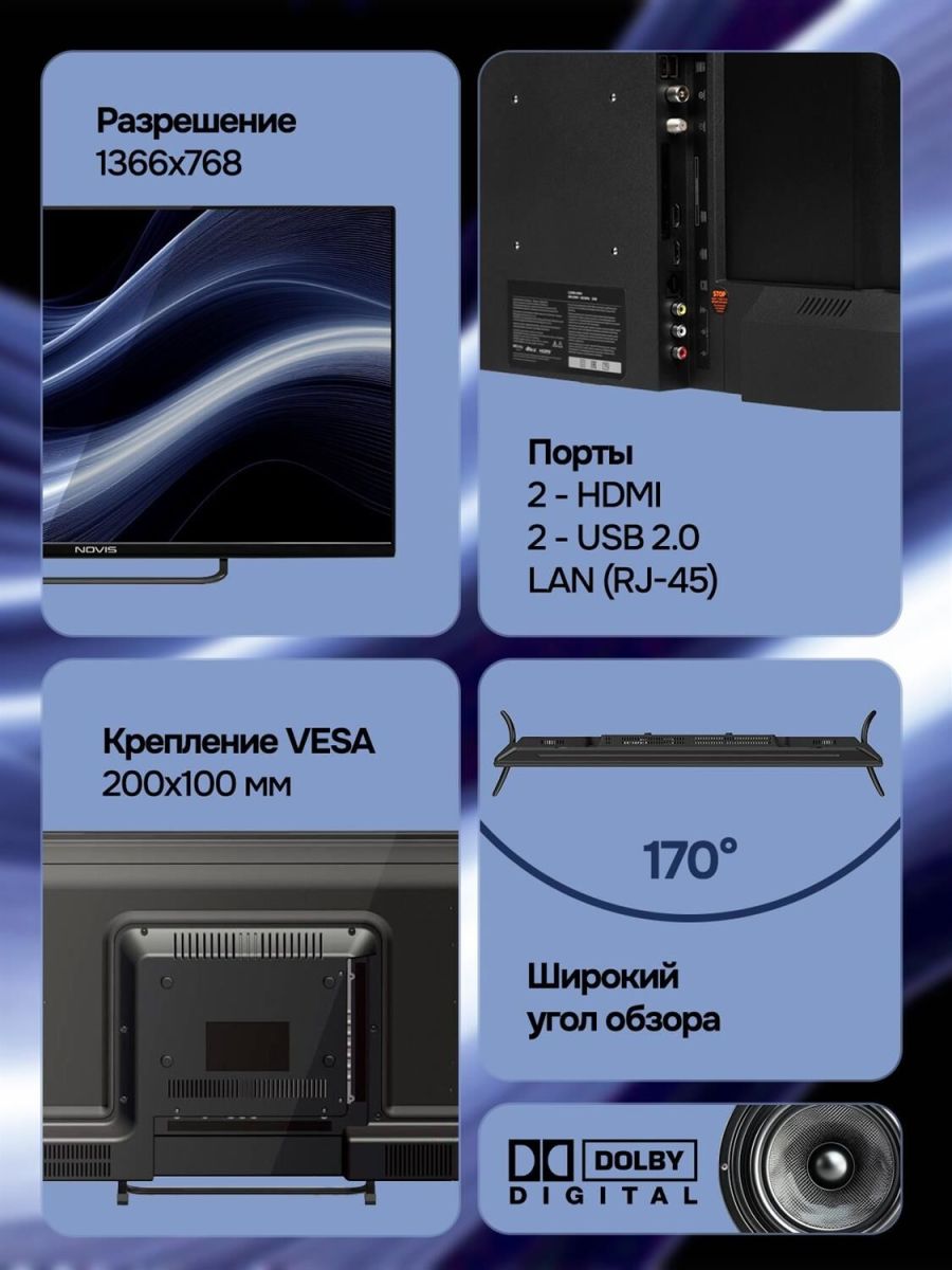 Размер 32", Разрешение 1366Х768,Частота 60гц, Контрастность 3000:1,Время отклика 8,5мс,Угол обзора 178х178, DVB-T2,DVB-C, Dolby AC-3, CI+, Smart 1G/8G, ,безрамочный, Android 13, Яндекс, Порты *2/HDMI ,*2/USB 2.0, LAN (RJ-45) ,мощность динамиков 2х7 вт ,Центральная металлическая подставка.VESA 200*100
