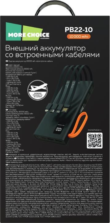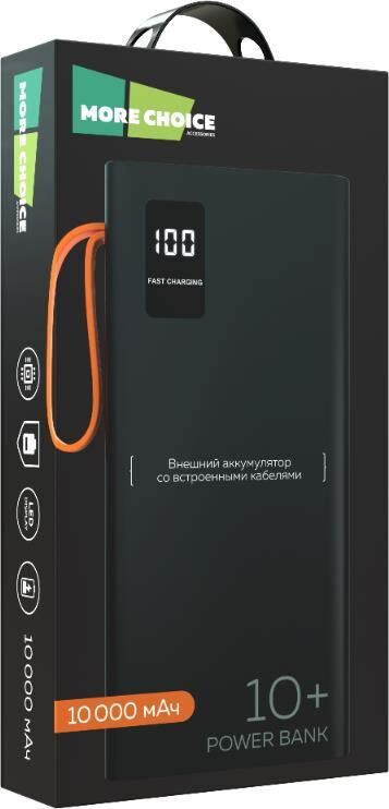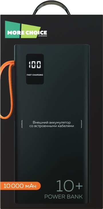Внешний аккумулятор More Choice PB22-10 идеально подходит для техкто всегда в движении и должны оставаться на связи. Аккумулятор оснащен четырмяпортами : USB, micro, Type-c, lighting. Таук же у данной мделумимеются четыре встроенные кабеля: USB, micro, Type-c, lighting. Внешний аккумулятор имеет несколько систем иентеоектуальной защиты: оот перегрева, перезаряда и скачков напряжения. Аккумулятор выполнен из высококачественных материалов, которые способны выдердать падение и скачки напряжения. Led-экран всегда покажет уровень заряда вашего внешнего аккумулятора.