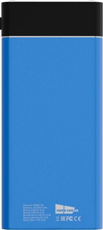 Внешний аккумулятор More choice PB40-30 - это портативное внешнее зарядное устройство для смартфонов, планшетов и других устройств. Аккумулятор имеет фактическую емкость 24000 mAh и оснащен тремя выходными портами USB и Micro-USB, которые подходят для большинства современных устройств. Он легкий и компактный, что делает его очень удобным для переноски в любые поездки, походы или просто для использования на работе или дома. Универсальный внешний аккумулятор поможет пользователям быстро восполнять заряд мобильных телефонов, планшетов, беспроводных наушников и другой техники. Оснащен интеллектуальной системой защиты от перегрева, перезаряда и скачков напряжения, LED дисплеем и встроенным фонариком. Изготовлен из качественного огнеупорного, ударопрочного, морозостойкого пластика. Размер устройства: 165*80*25 мм. Вес: 635 г.