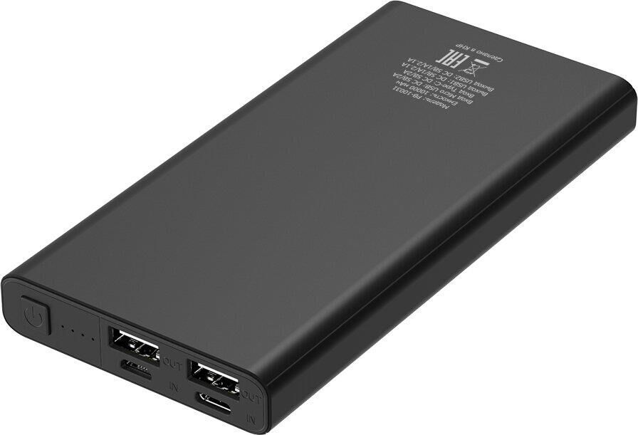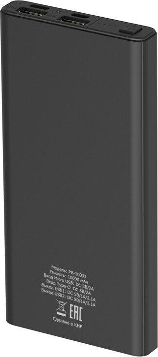 ВНЕШНИЙ АККУМУЛЯТОР ДЛЯ ЗАРЯДКИ МОБИЛЬНЫХ УСТРОЙСТВ. Ёмкость батареи: 10 000mAh (37 Вт⋅ч); Тип батареи Li-Pol; Вход 2 USB: Micro USB (2А), Type-C (2А); Выход 2 USB: 5V/1A и 5V/2A; LED индикатор заряда, Защита от перегрузки, Защита от короткого замыкания, Одновременная зарядка двух устройств, Материал корпуса: металл.