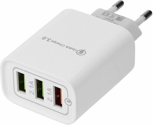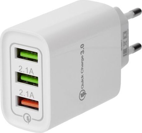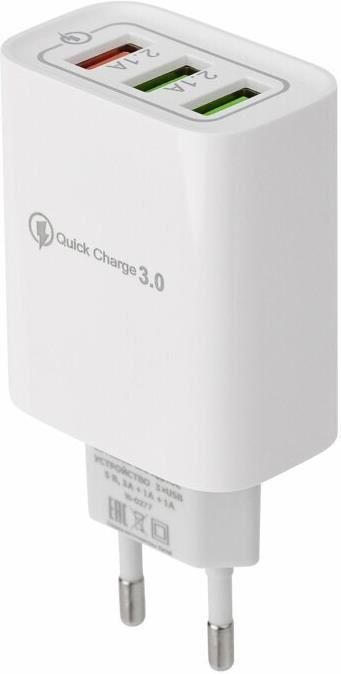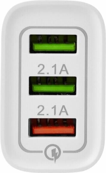 Сетевое зарядное устройство 3 x USB 5V, 2.1 А + 2.1 А + 2.1 А белого цвета предназначено для обеспечения зарядки трех портативных электронных устройств. Зарядное устройство оснащено евровилкой для фиксации в розетках российского и европейского типа. Позволит передать питание с силой тока 2.1 А и 1.8 А на различные портативные аксессуары: мобильные телефоны, планшеты, наушники, осветительные приборы, бытовую технику USB. Адаптер не подвержен перегреванию даже при подключении к нему сразу всех доступных устройств. С технологией Quick charge гаджеты заряжаются значительно быстрее, чем с обычными зарядными устройствами. Корпус сетевого адаптера изготовлен из термостойкого и ударопрочного пластика. Подбирайте адаптер исходя из необходимой мощности для зарядки устройства. Входное напряжение: 100–240 В Выходное напряжение: 5 В, 2.1 А + 2.1 А + 2.1 А, USB Ax3 Размер: 80x50x25 мм Цвет: белый