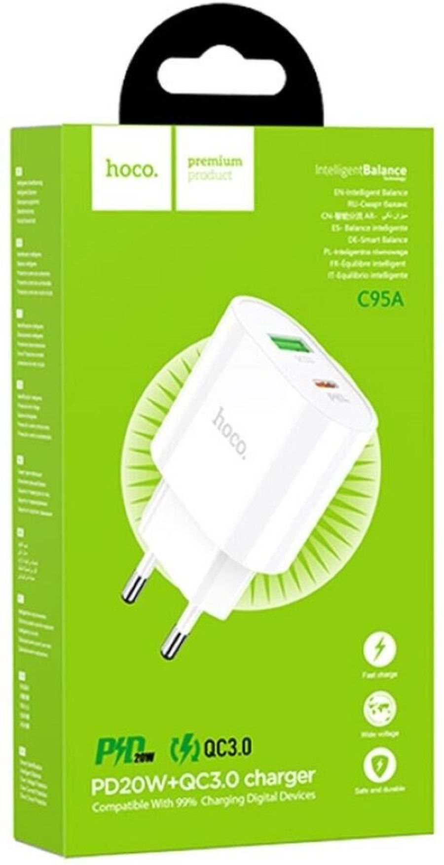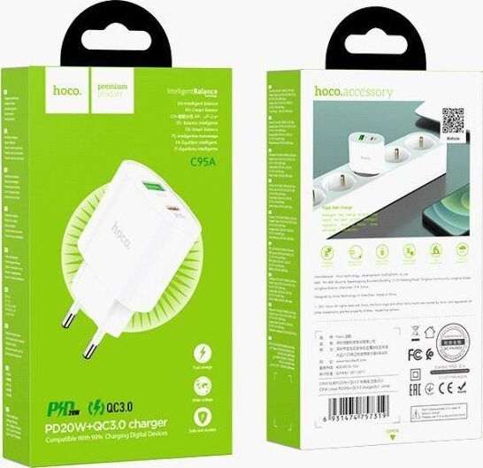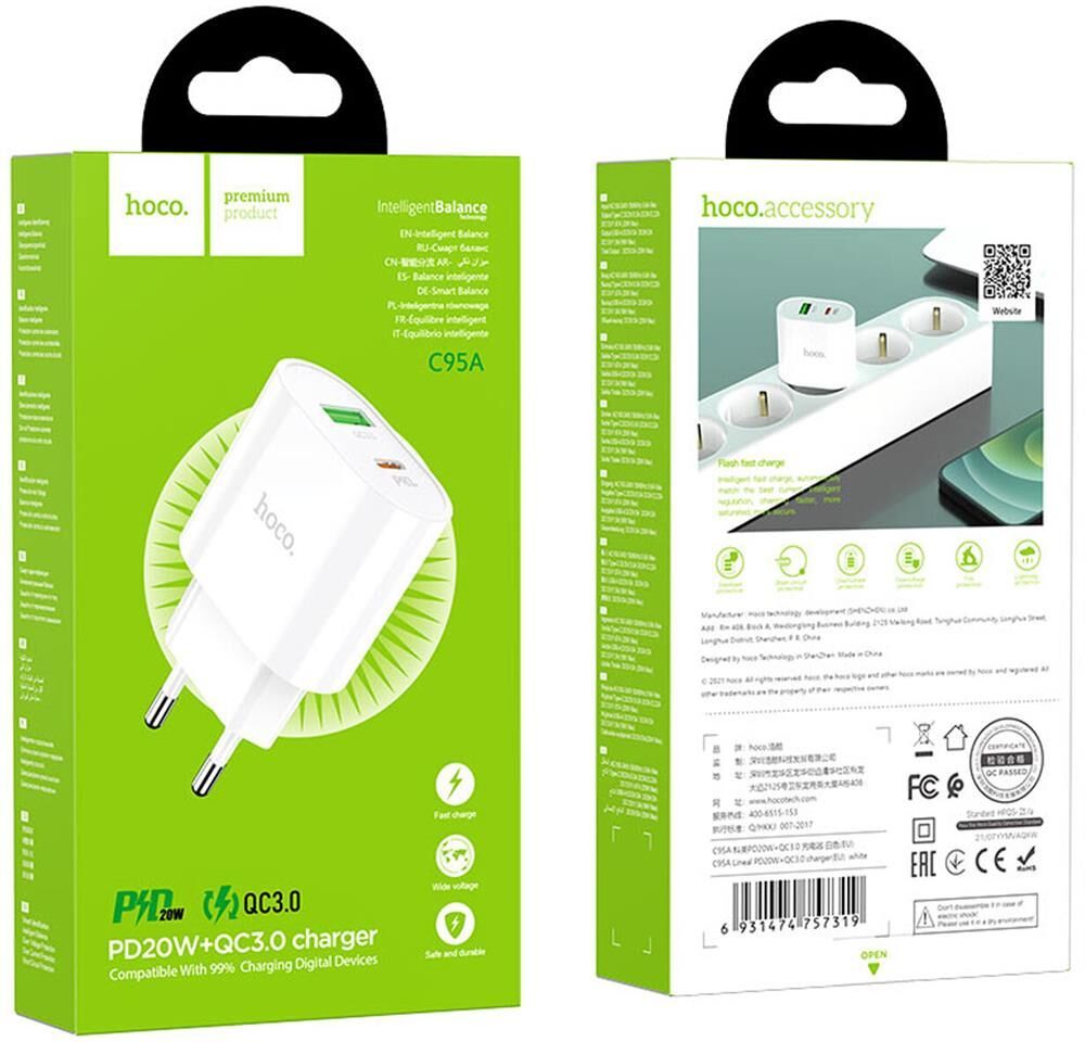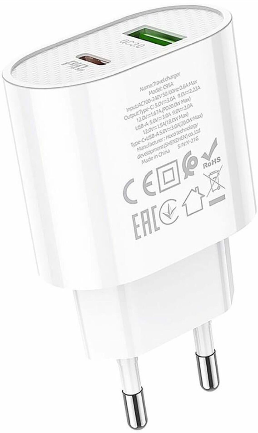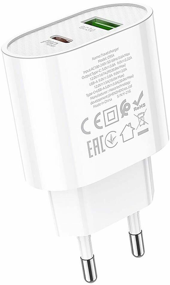 1. Материал: огнестойкий материал PC + ABS 2. Выход: Type-C: PD 20W; USB-A: QC 18W; Type-C+ USB-A: 5V/3A. 3. Поддержка протоколов зарядки PD20W, QC3.0 / QC2.0, AFC, PPS и т. д. 4. Штекер EU. 5. Размер: 75 * 45 * 24 мм, вес: 40 г.