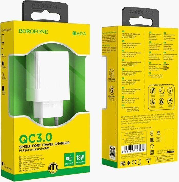 1. Вход: AC100-240V, 50 / 60Hz, 0.6A. 2. Выход: USB: 5V / 3A, 9V / 2A, 12V / 1.5A, 18W. 3. Вилка EU. Огнестойкий материал PC. 4. Поддержка QC3.0 / QC2.0, быстрой зарядки для Huawei FCP, быстрой зарядки для Samsung AFC, для iP 2.4A и других протоколов быстрой зарядки. 4. Размеры зарядного устройства: 88 * 42 * 26мм. Вес: 38г.