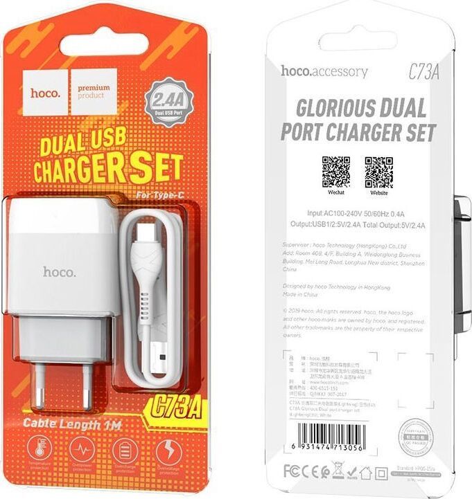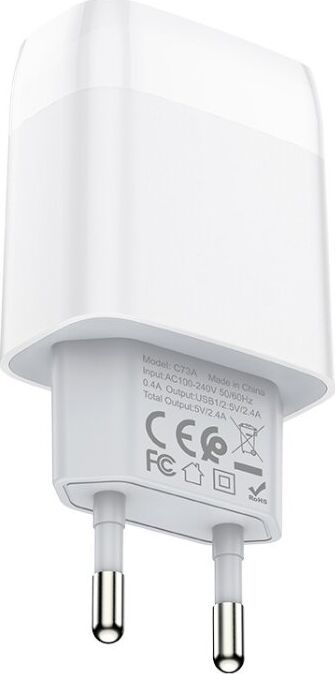Вход: AC100-240V, 50 / 60Hz, 0.4A. Выход USB 1 / 2: 5V-2.4A. Общий выход: 5V-2.4A макс. EU штекер. Материал: огнеупорный PC. Двойной USB выход 2.4A макс (intelligent balance). Набор с зарядным кабелем X37 1м для Type-C. Размер 82*42*26мм. Вес зарядного устройства 34г, вес набора с кабелем 56г.