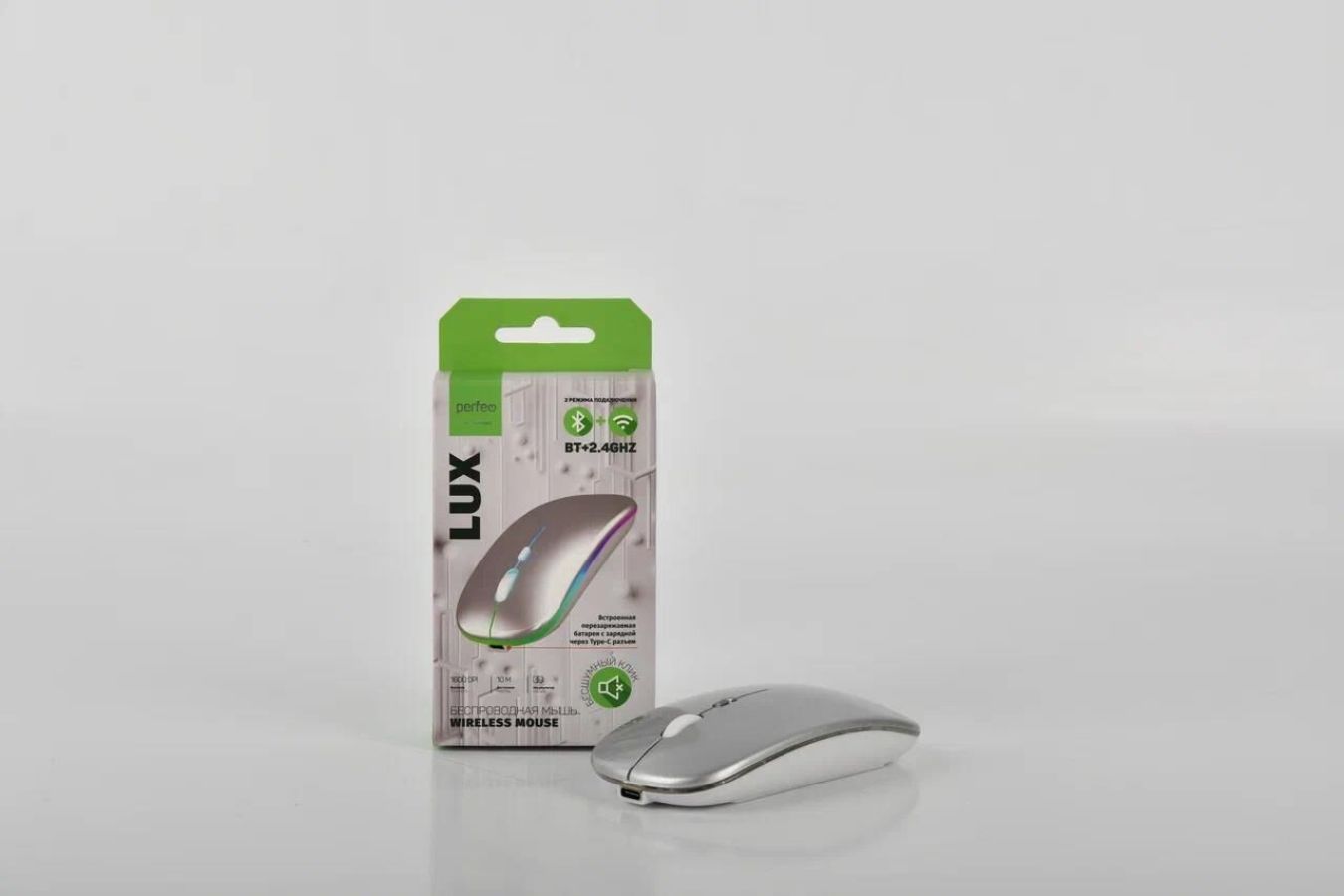 МОДЕЛЬ: LUX (БЕСПРОВОДНАЯ) • Два режима подключения (радиочастота 2,4 ГГц или Bluetooth) • Усовершенствованная беспроводная технология (радиус работы до 10 м) • Высокоточный сенсор с переключаемым разрешением: 800/1200/1600 DPI • Четыре кнопки с колесом прокрутки • Бесшумные кнопки • Прорезиненное колесо прокрутки • Plug'n'Play, не требуется установка ПО • Симметричная форма мыши подходит для правой и левой руки • Внутренняя контурная RGB подсветка • Мини-ресивер USB (в комплекте) • Зарядка через кабель Type-C (в комплекте) • Выключатель питания мыши • Системные требования: Windows 10/8/7/XP, Mac OS, свободный порт USB • Размеры: 112 × 57,2 × 25,9 мм