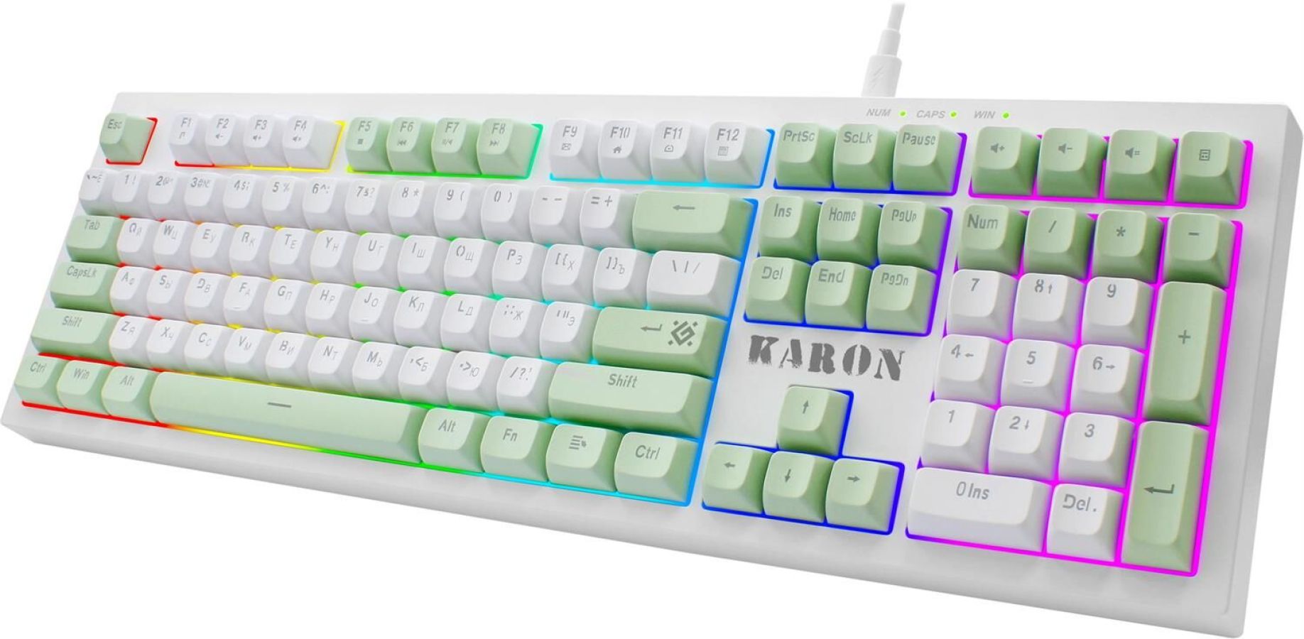 Проводная игровая клавиатура с регулируемой радужной подсветкой и кейкапами двух цветов. В данной модели представлены все самые необходимые игровые функции: блокировка клавиши WIN, обмен функциями между клавишами WASD и стрелками, 19 клавиш поддерживают технологию anti-ghost.