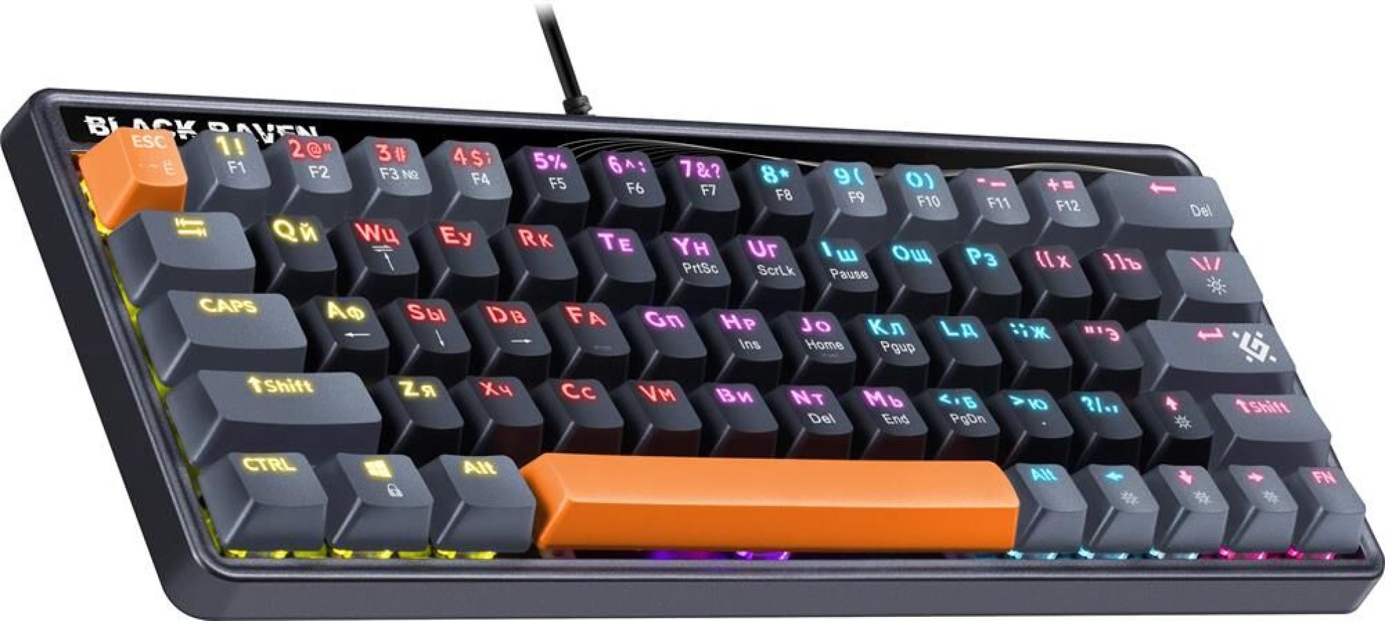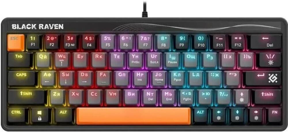 Клавиатура проводная, механическая, ультракомпактная с кейкапами трех цветов и тихими красными переключателями.Интерфейс подключения USB Количество клавиш 63 шт. Количество дополнительных клавиш (функций) 12 (+FN), 12 режимов подсветки, Функция Anti-ghost, Обмен функциями между клавишами "↑←↓→" и "WASD", резиновые ножки, длина кабеля - 1,5 м.