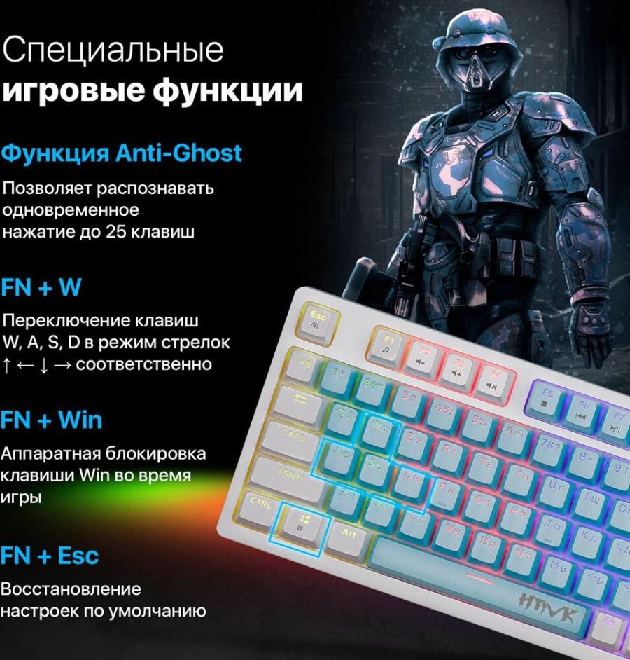 Комплектация: Игровая клавиатура , Подсветка: подсветка клавиш , Раскладка клавиатуры: английская/русская (ISO)