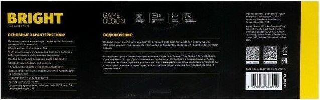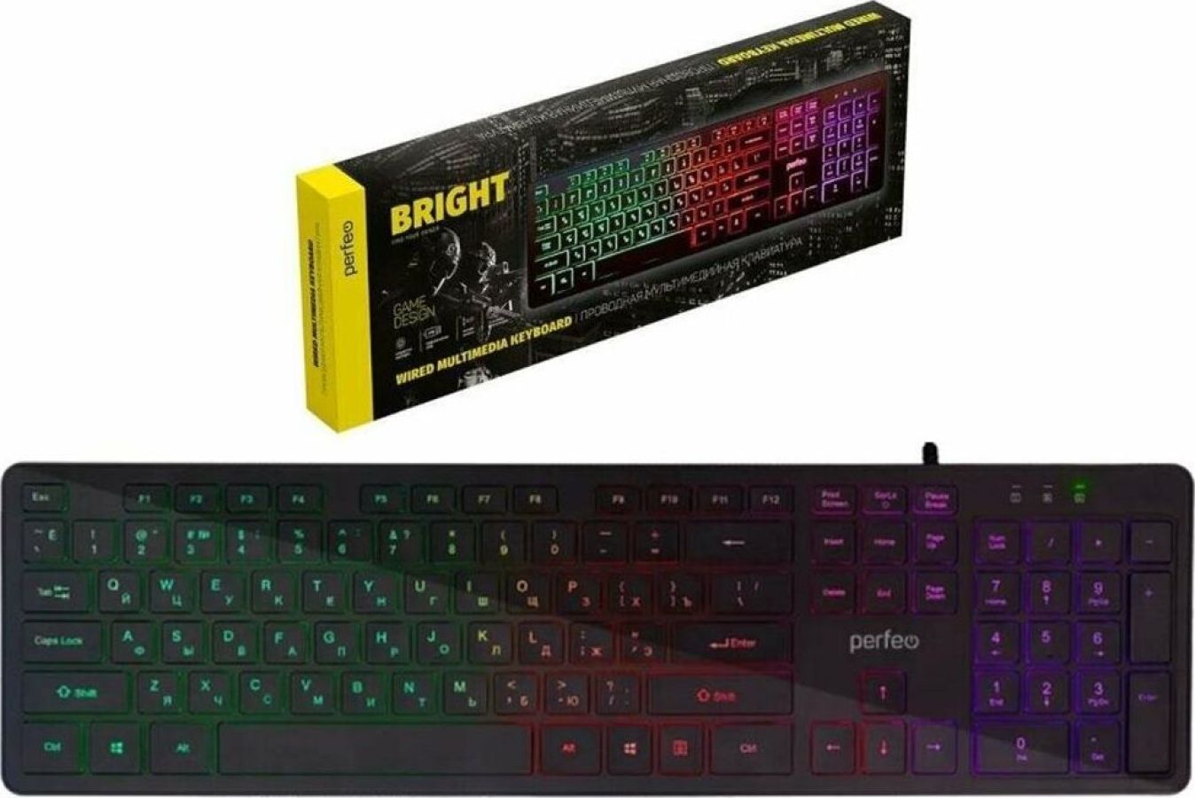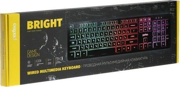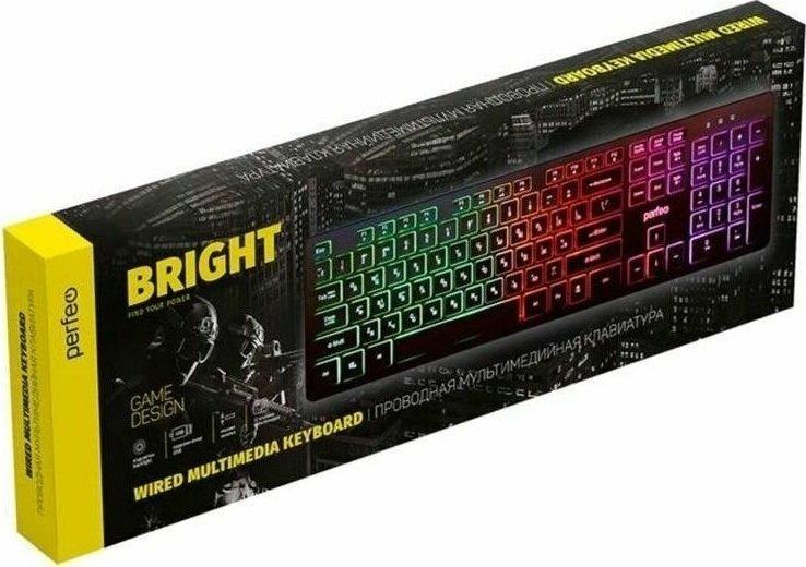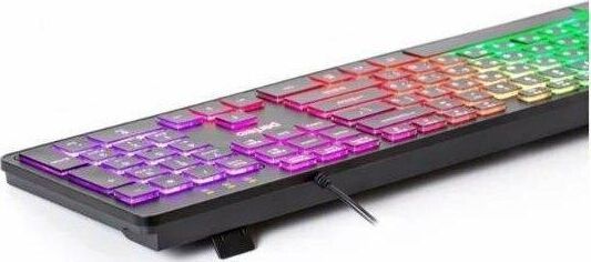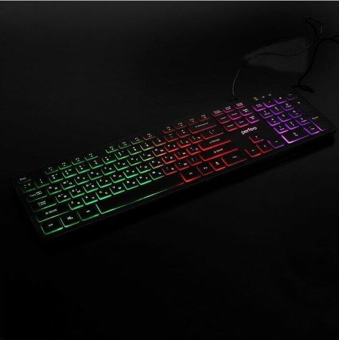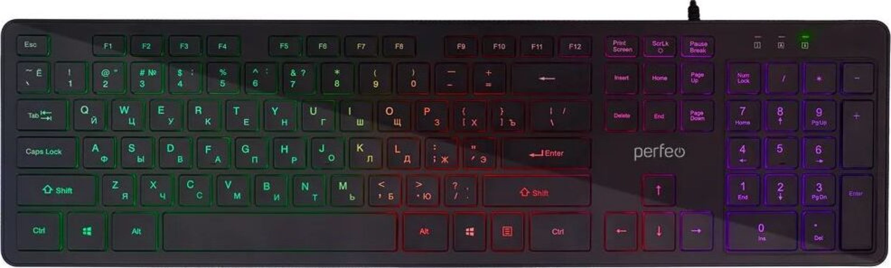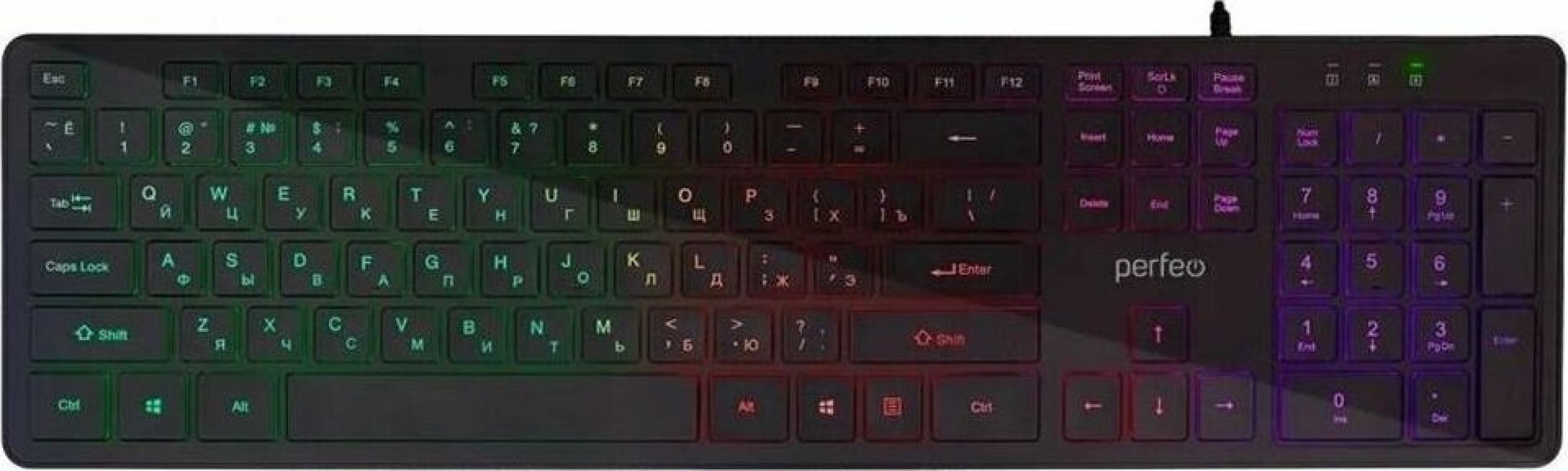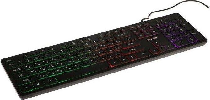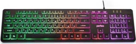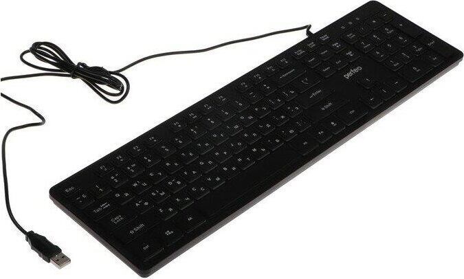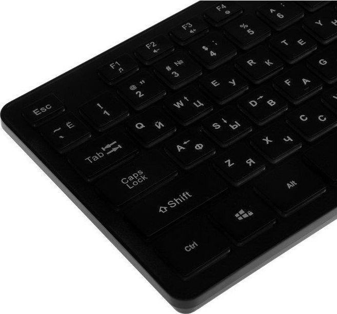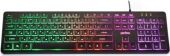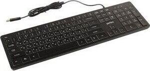 Клавиатура проводная, мультимедийная, интерфейс USB, количество кнопок - 104, количество функциональных клавиш быстрого доступа к различным функциям ОС - 12, защита от влаги, внутренняя LED-подсветка, длина кабеля - 1,8 м.