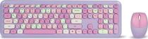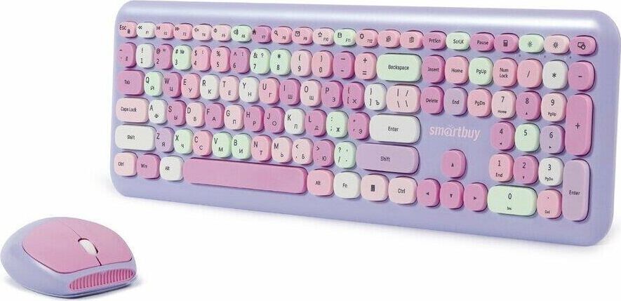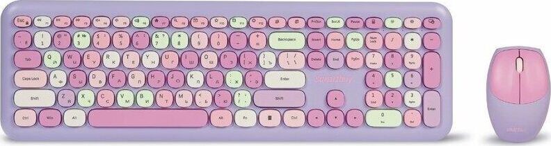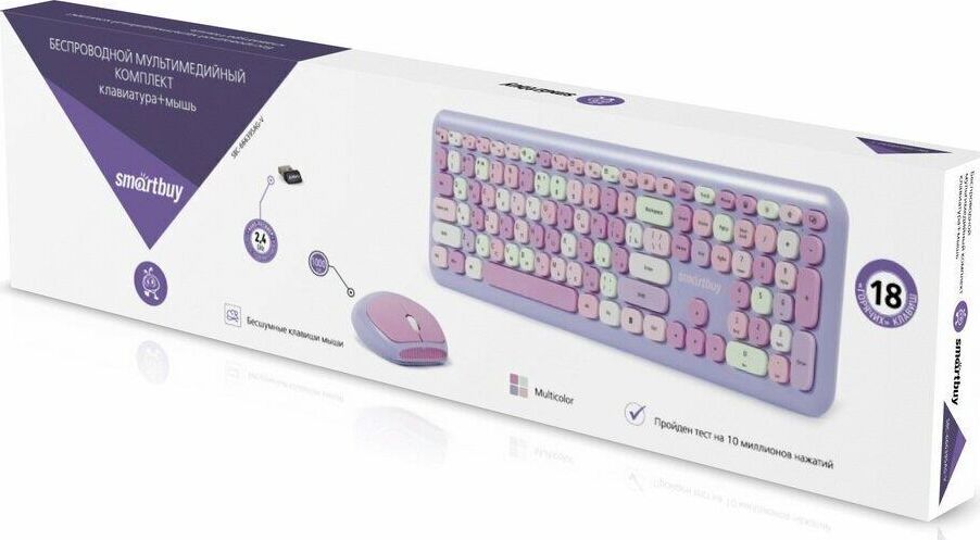 Цвет мыши: фиолетовыйТип сенсора: ОптическийКоличество кнопок мыши: 3Радиус действия: до 10 мПитание мыши: 1 батарейка ААИнтерфейс подключения: USBЦвет клавиатуры: белыйПитание клавиатуры: 1 батарейка ААА